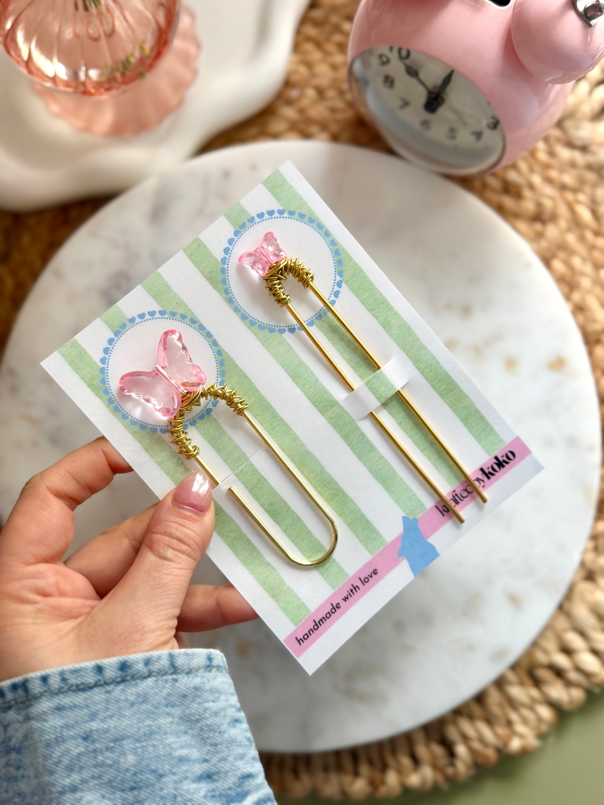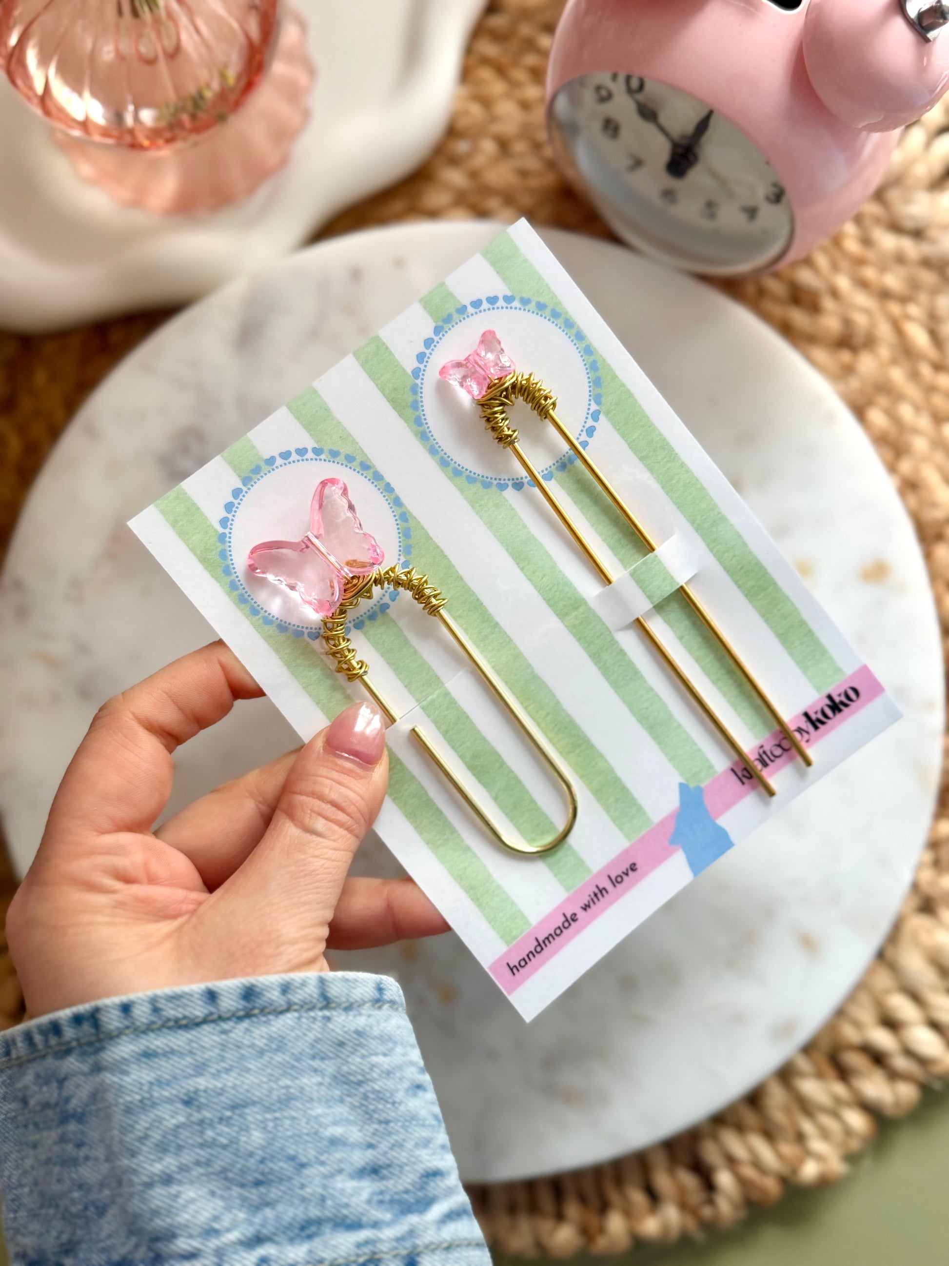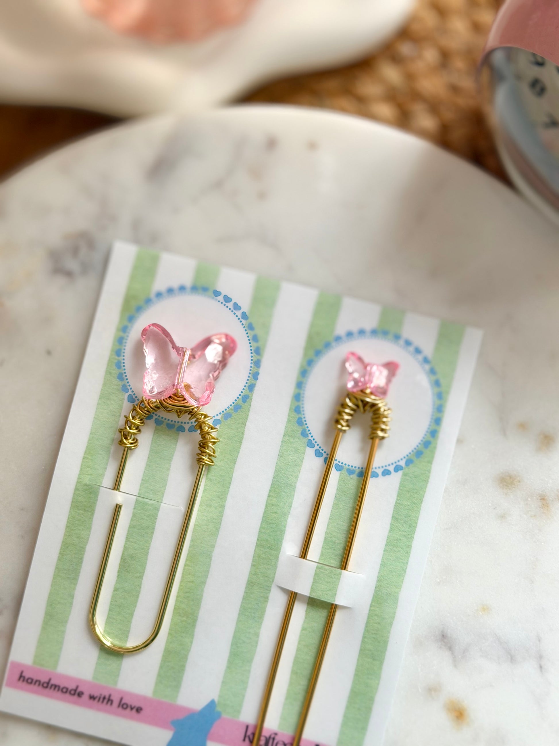 This set features a larger pink crystal butterfly on a jumbo paperclip paired with a coordinating medium-sized butterfly on a pocket pin. Designed to complement each other beautifully, this duo adds the perfect touch of soft shimmer and charm to your setup.