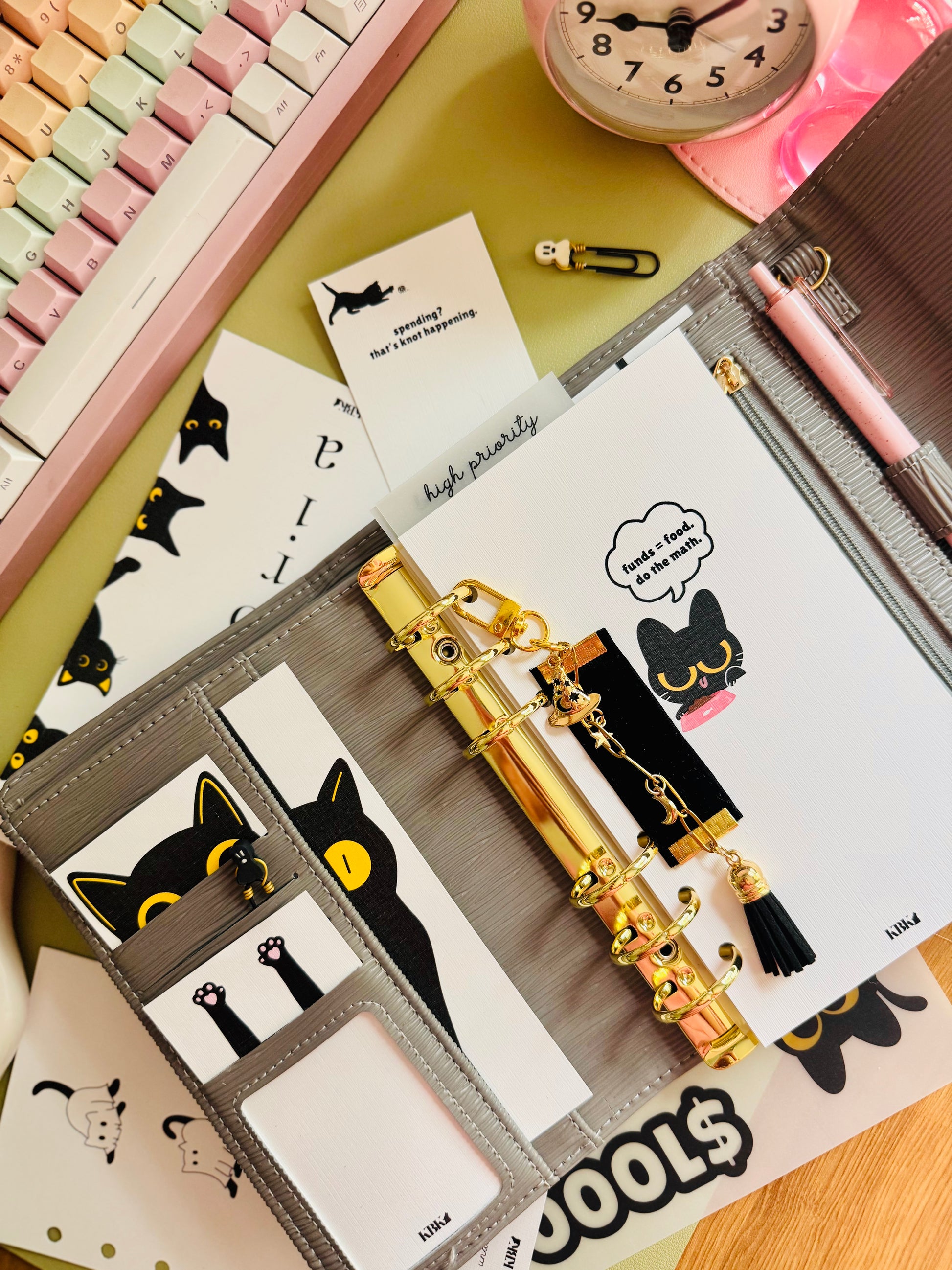 Because sometimes saving feels just like waiting for dinner. This playful dashboard features a little black cat with plenty of attitude, staring down his empty food bowl and demanding his human to “feed me.” A perfect match to the Shadow Paws Collection, it mixes bold black-and-white with hints of pastel and yellow for that signature pop of personality.