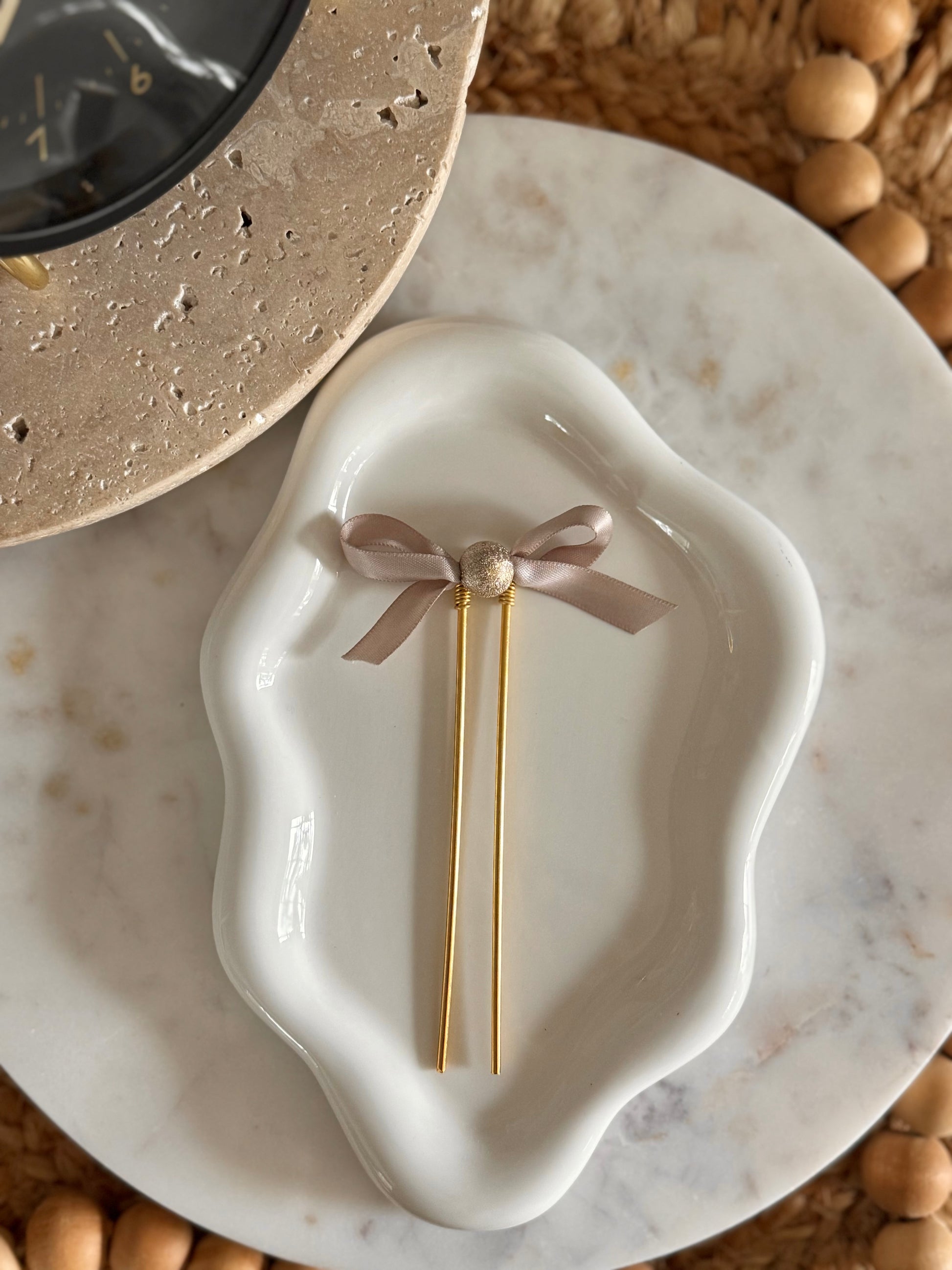 A gentle weave of warmth and artistry. The Gilded Thread PocketPin features a hammered metallic bead hand-wrapped in gold wire, with a soft ribbon threaded gracefully through its center. Available in your choice of Oatmilk Cashmere or Honey Taupe each piece blends texture and tone to create a calm, refined accent that feels both timeless and personal.