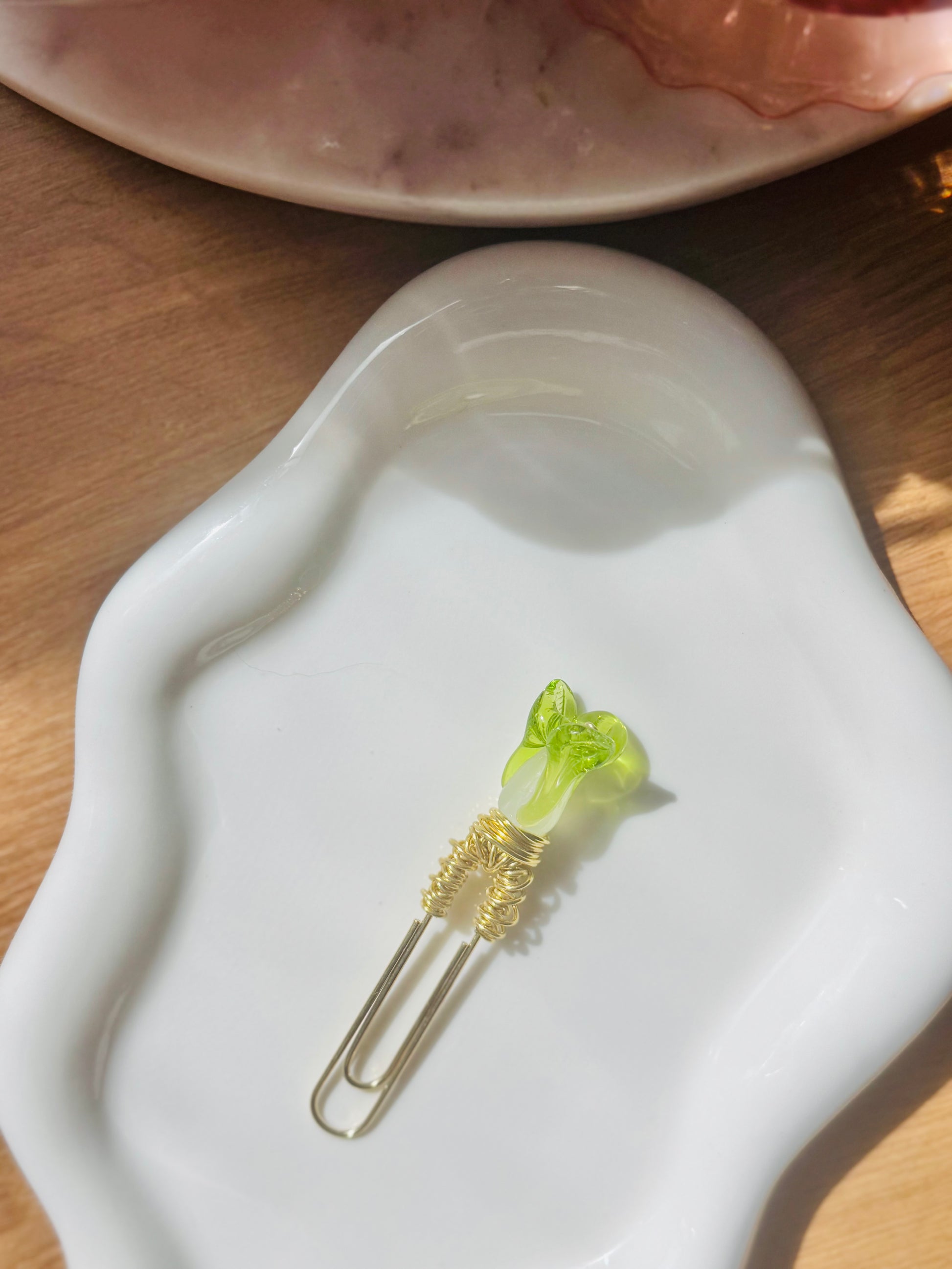 Add a burst of whimsy to your day with the Kinchaku Sprout paperclip! Featuring a hand-blown glass bead inspired by fresh bokchoy, this charming clip brings a playful splash of color and unique flair to your planner, notebooks, or wallet. Wrapped in delicate wire and bursting with personality, it’s the perfect little pop of fun to brighten your organization routine!
