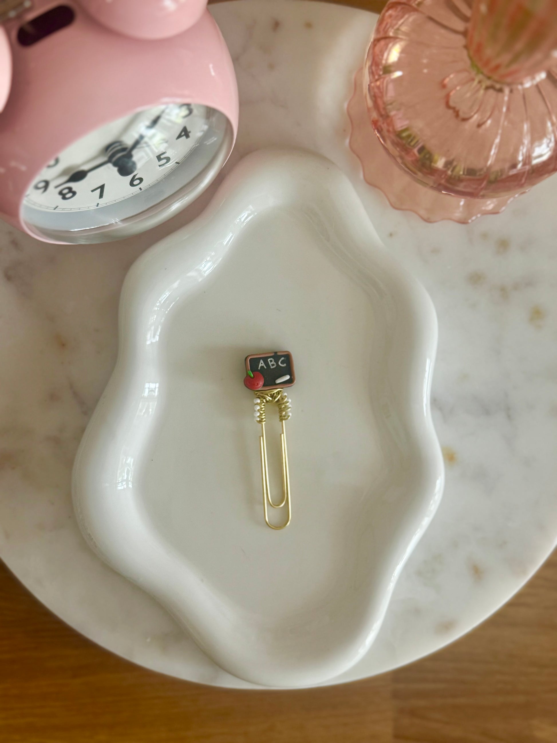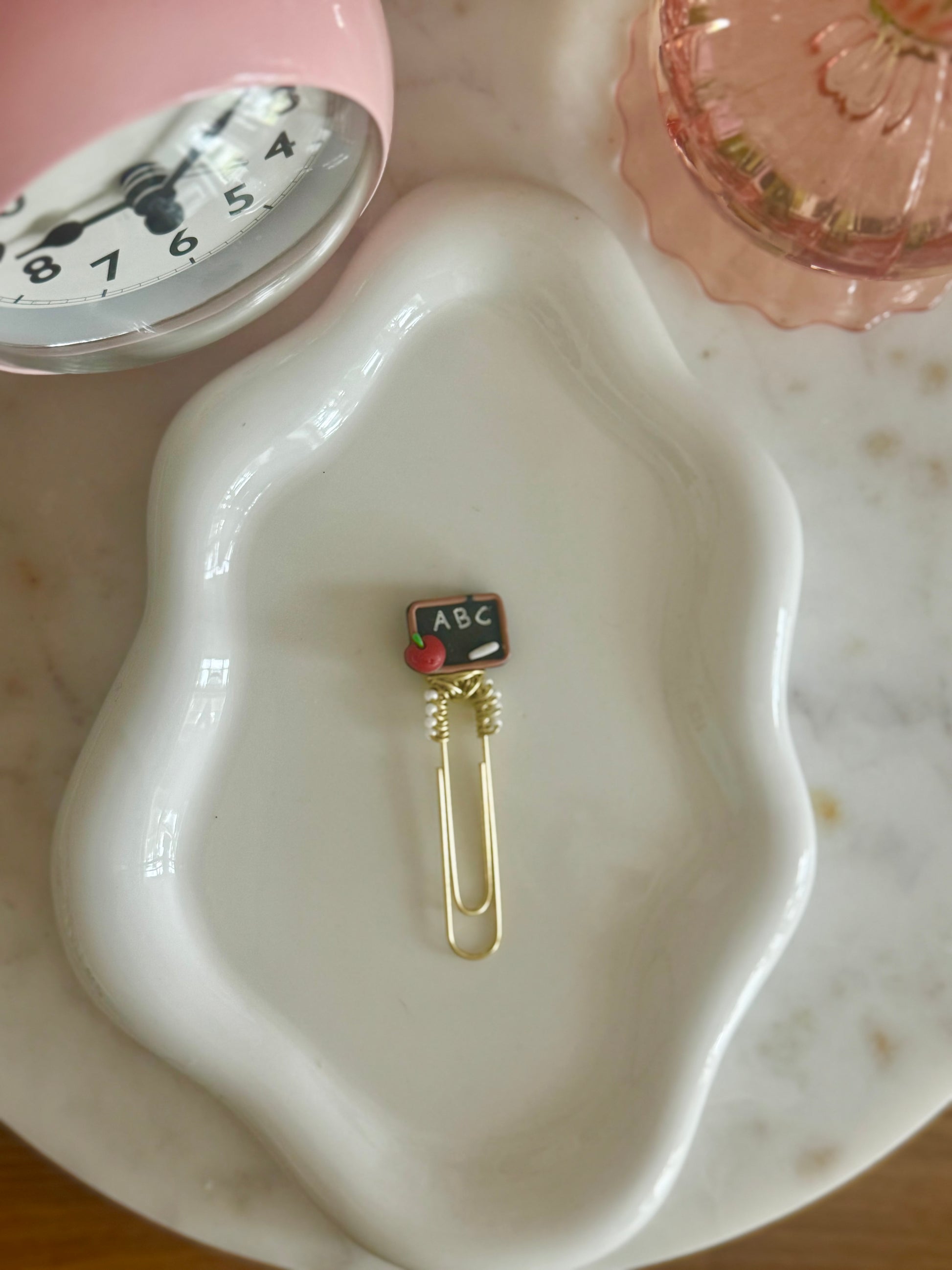 Bring a touch of timeless classroom charm to your planner with Klassic Chalk! This hand-wired paperklip features a mini chalkboard design with bright white “ABC” lettering and a sweet red apple accent, all perched atop a sturdy paperklip.