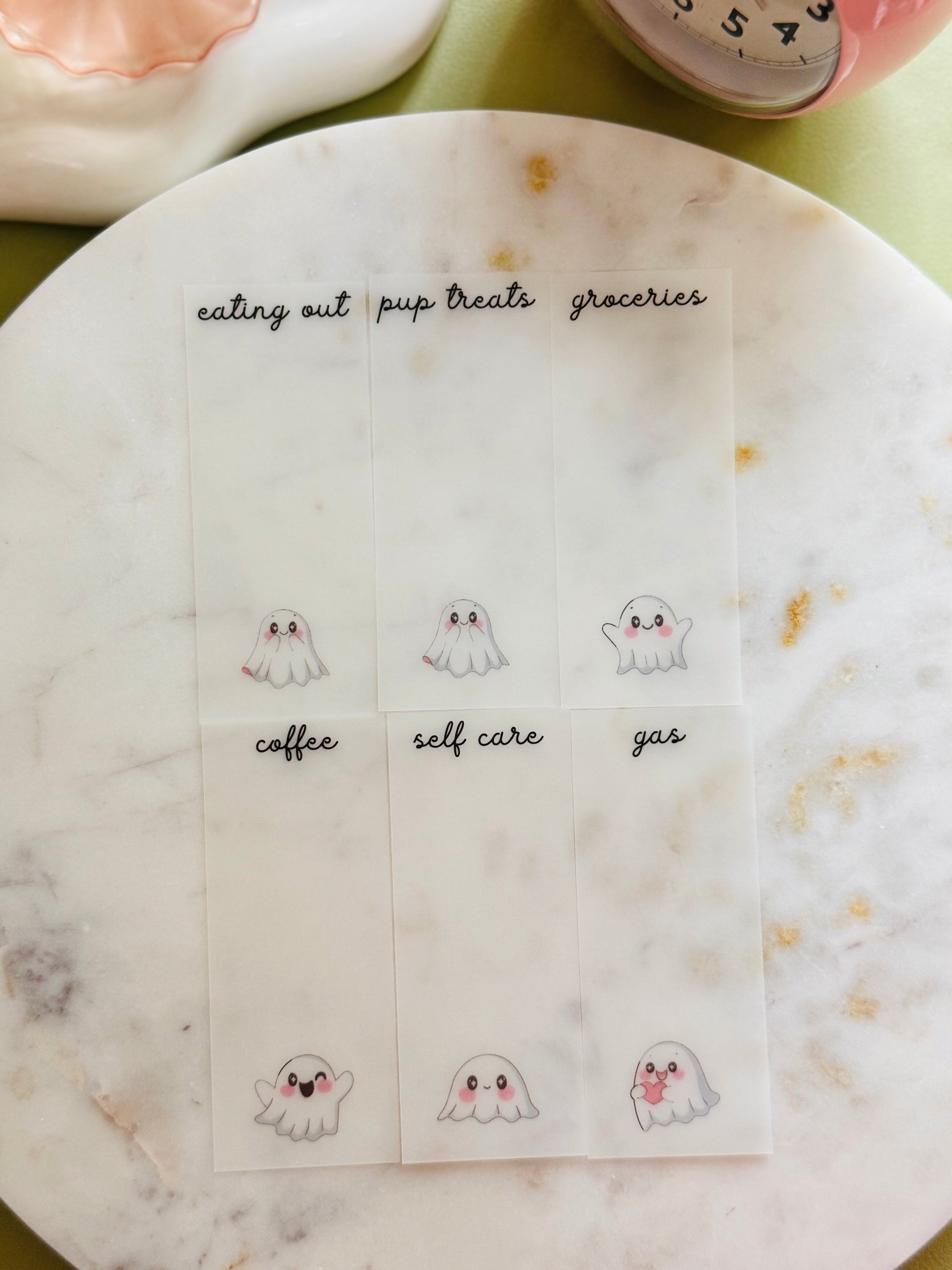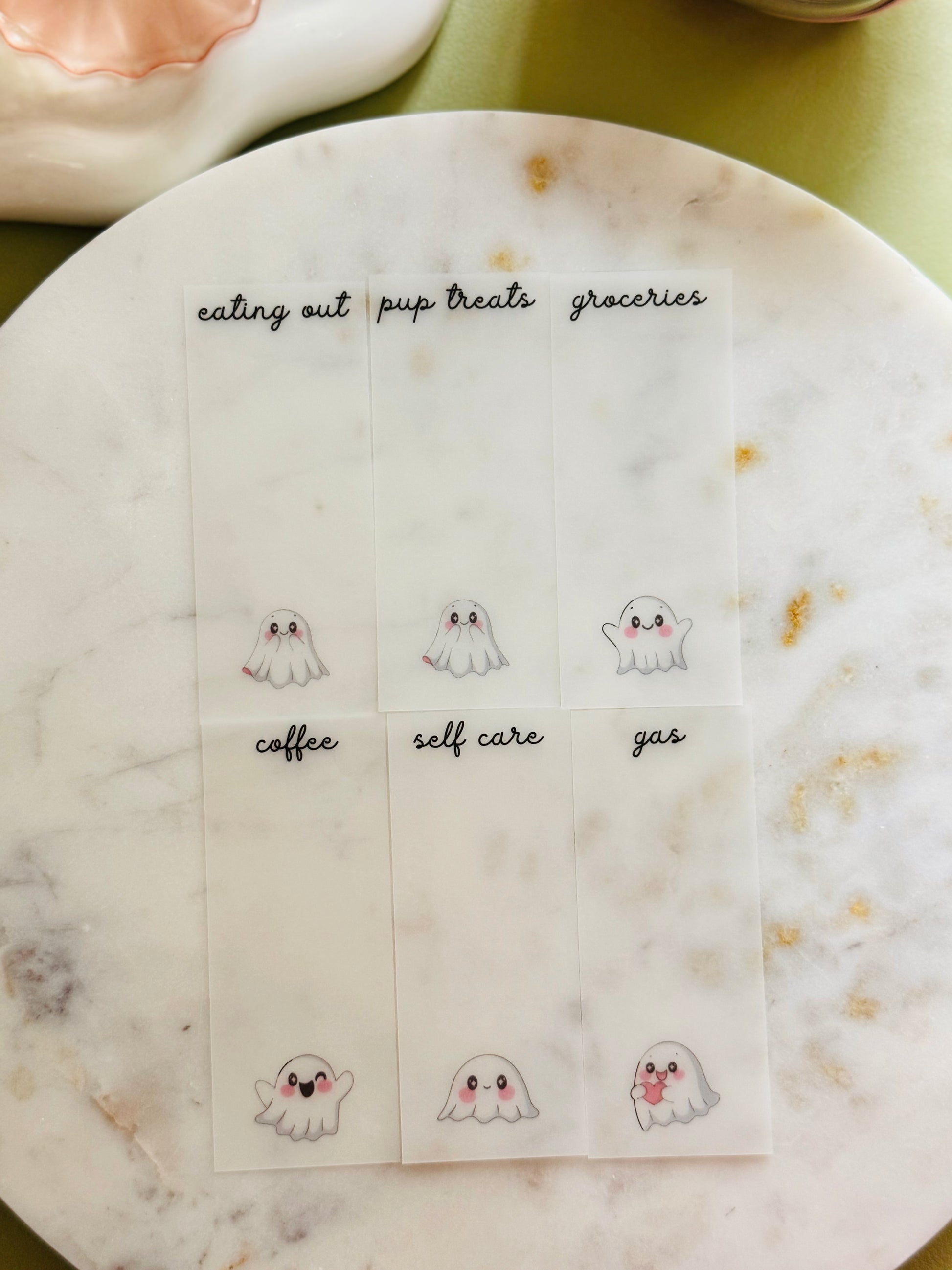 Each tab is customizable with your text, letting you label your envelopes with categories like Groceries, Savings, Gas, or whatever fits your budgeting style. Designed to fit perfectly inside your cash envelopes, the titles peek out at the top while the ghosts at the bottom keep things playful and cute.