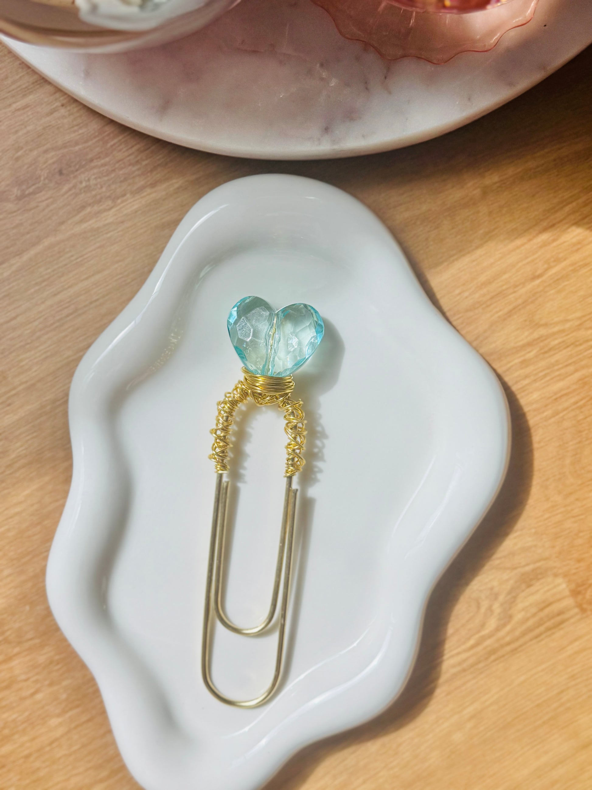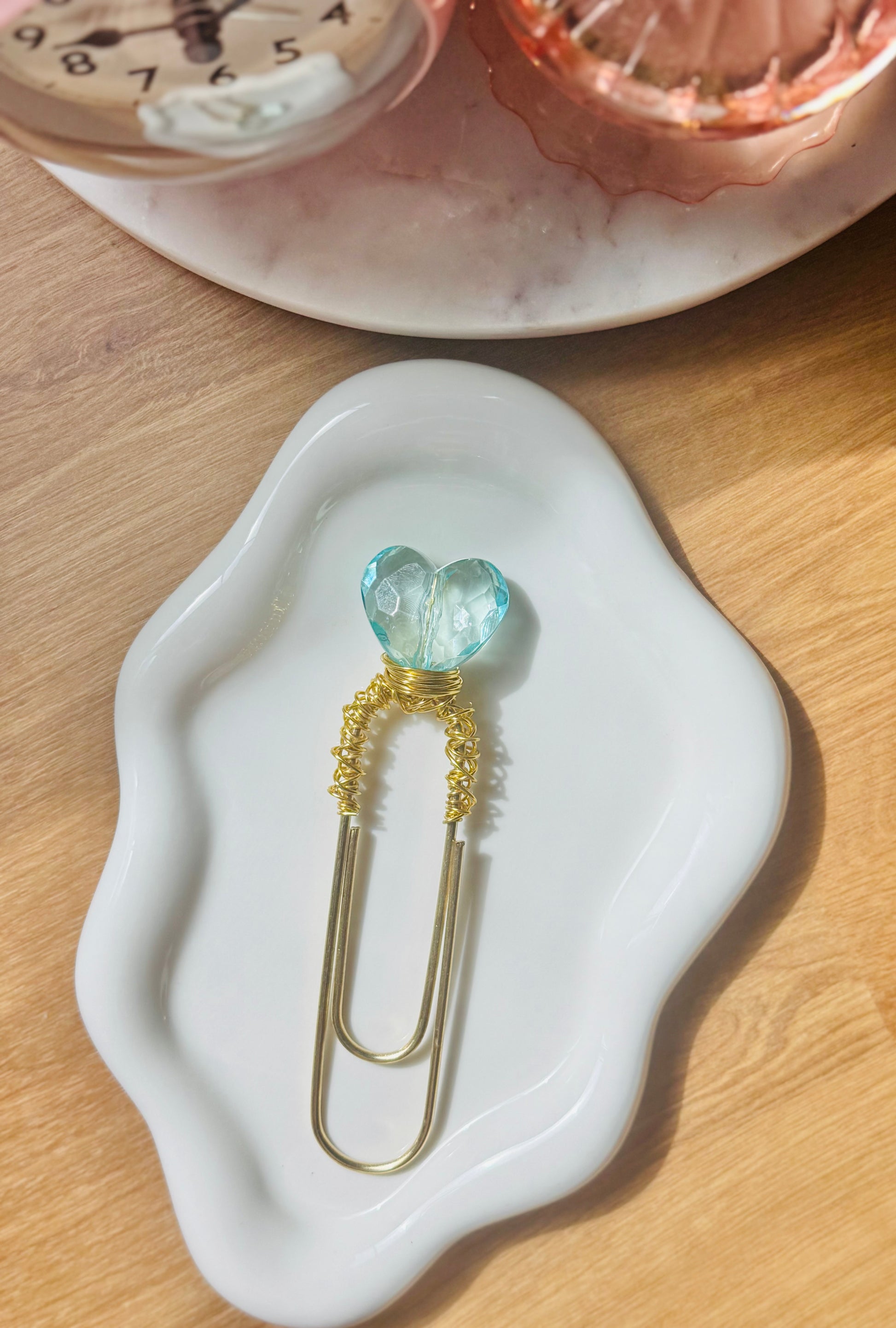 Capture the serene beauty of the ocean with the Loving Tides paperclip. Featuring a large teal heart set atop a gleaming gold clip wrapped in delicate gold wire, this piece evokes the gentle ebb and flow of calm tides. Perfect for adding a touch of tranquil elegance to your planner, journals, or wallet. Let every page feel like a peaceful moment by the sea.