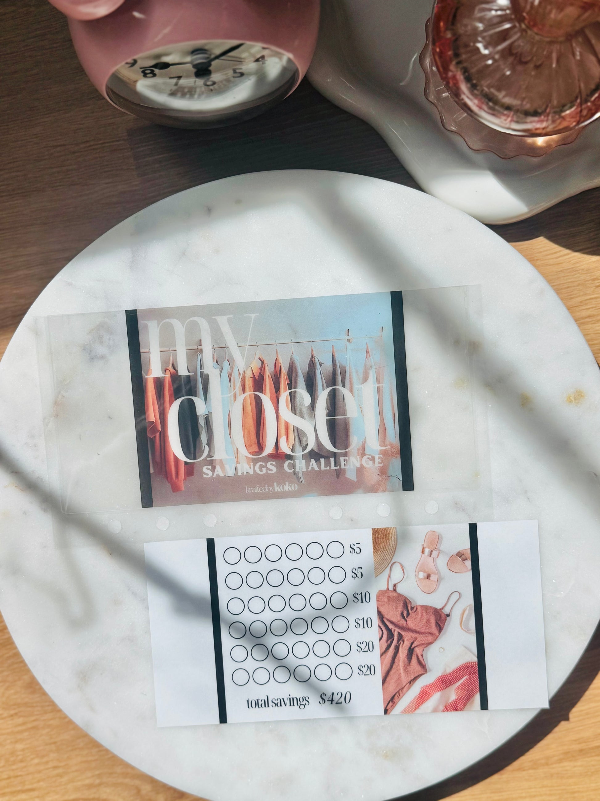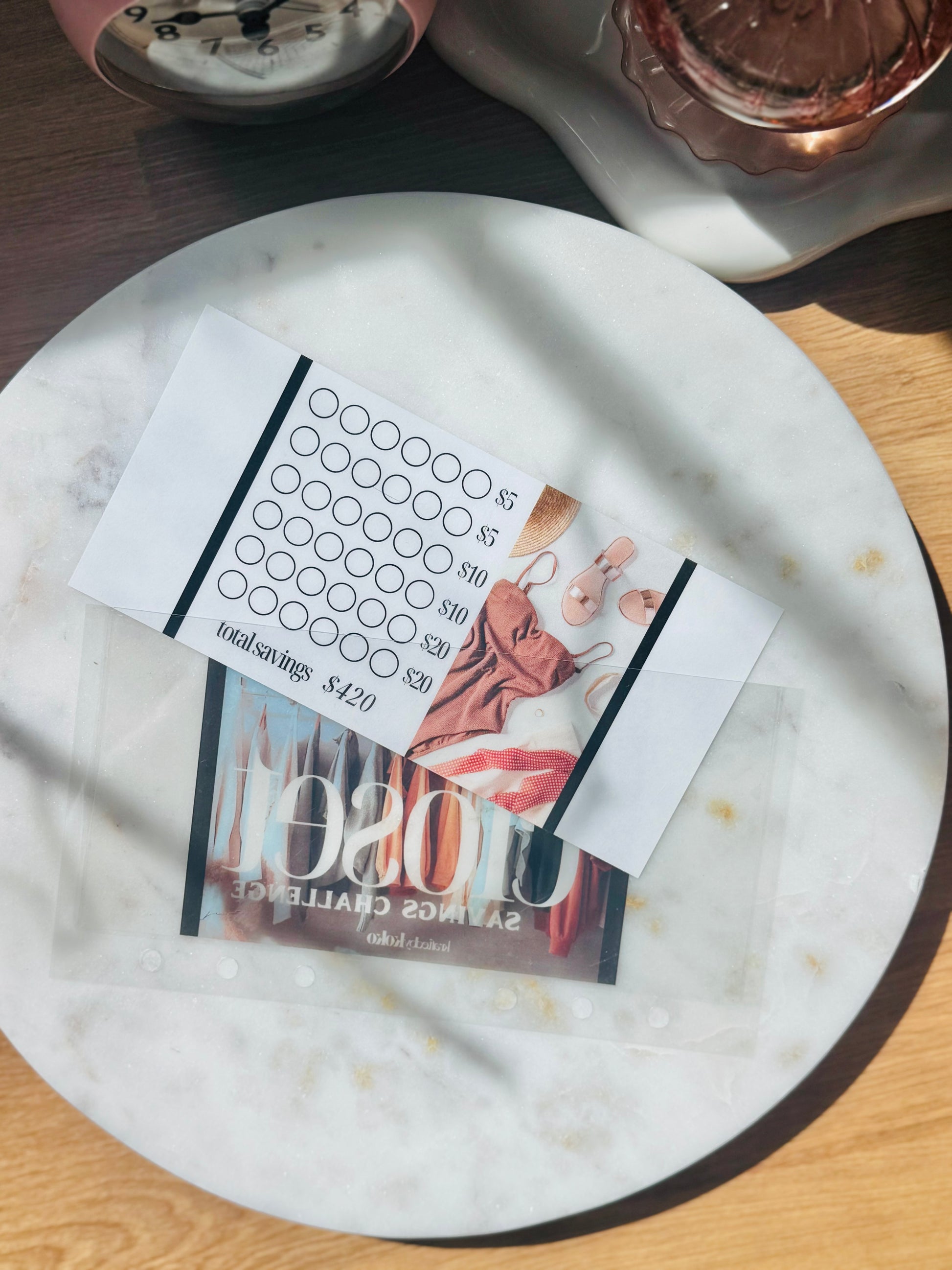 Elevate your wardrobe with this chic savings challenge designed to help you save up to $420. Featuring a clear transparent envelope so you can watch your savings grow, paired with a glossy white tracker for a sleek, modern finish. Whether refreshing your everyday staples or indulging in statement pieces, this challenge makes building your dream closet both fun and effortless.