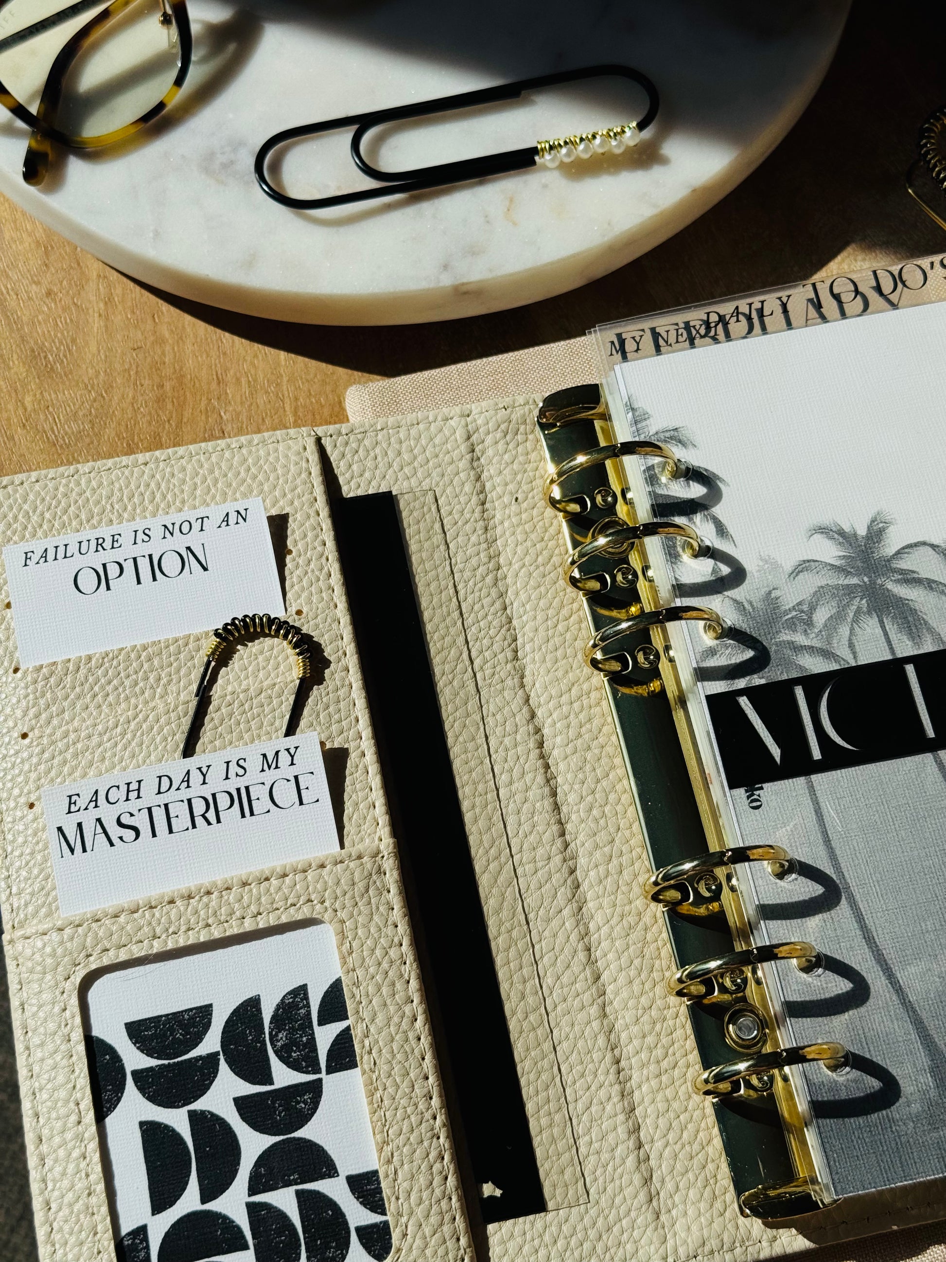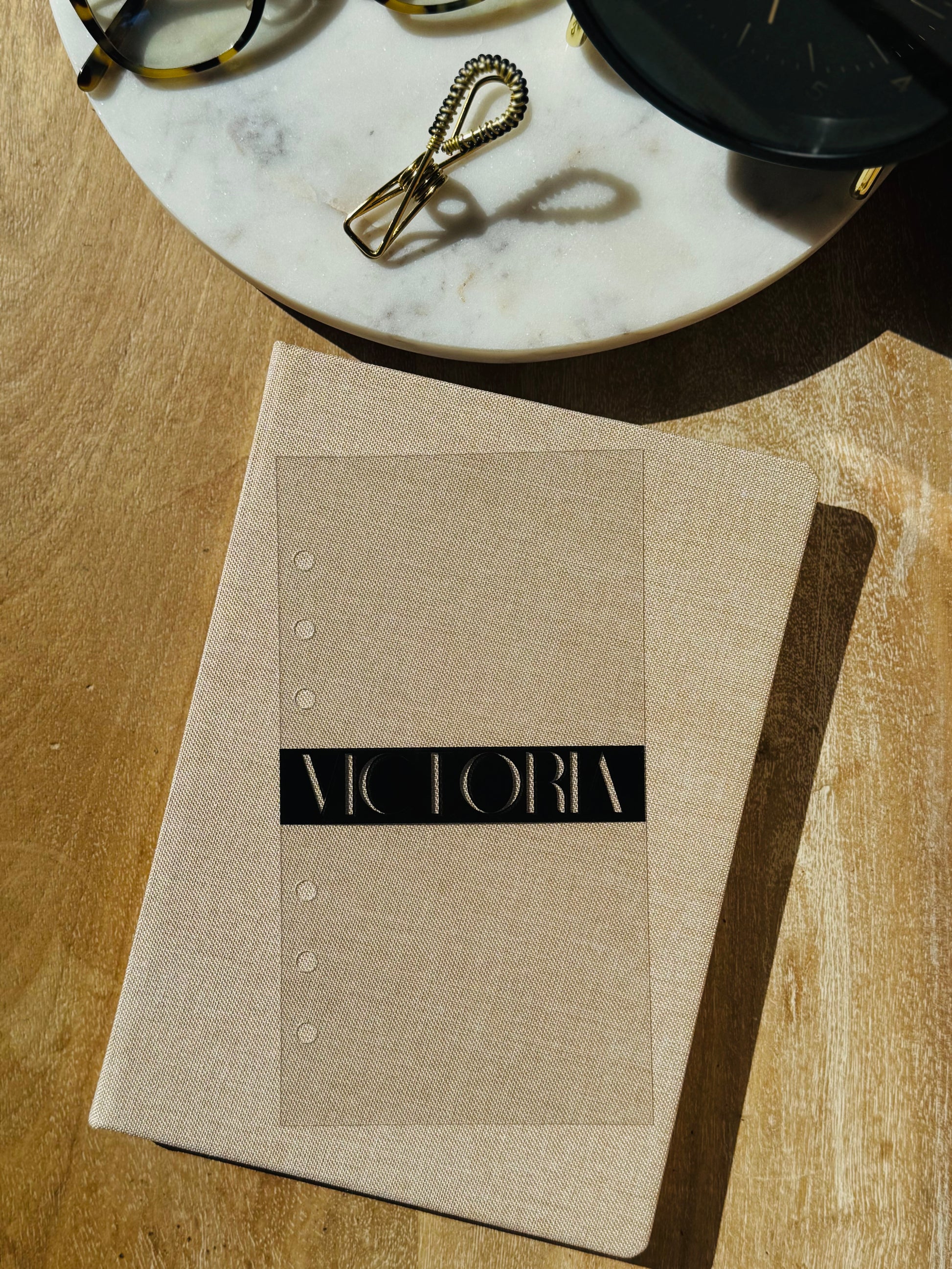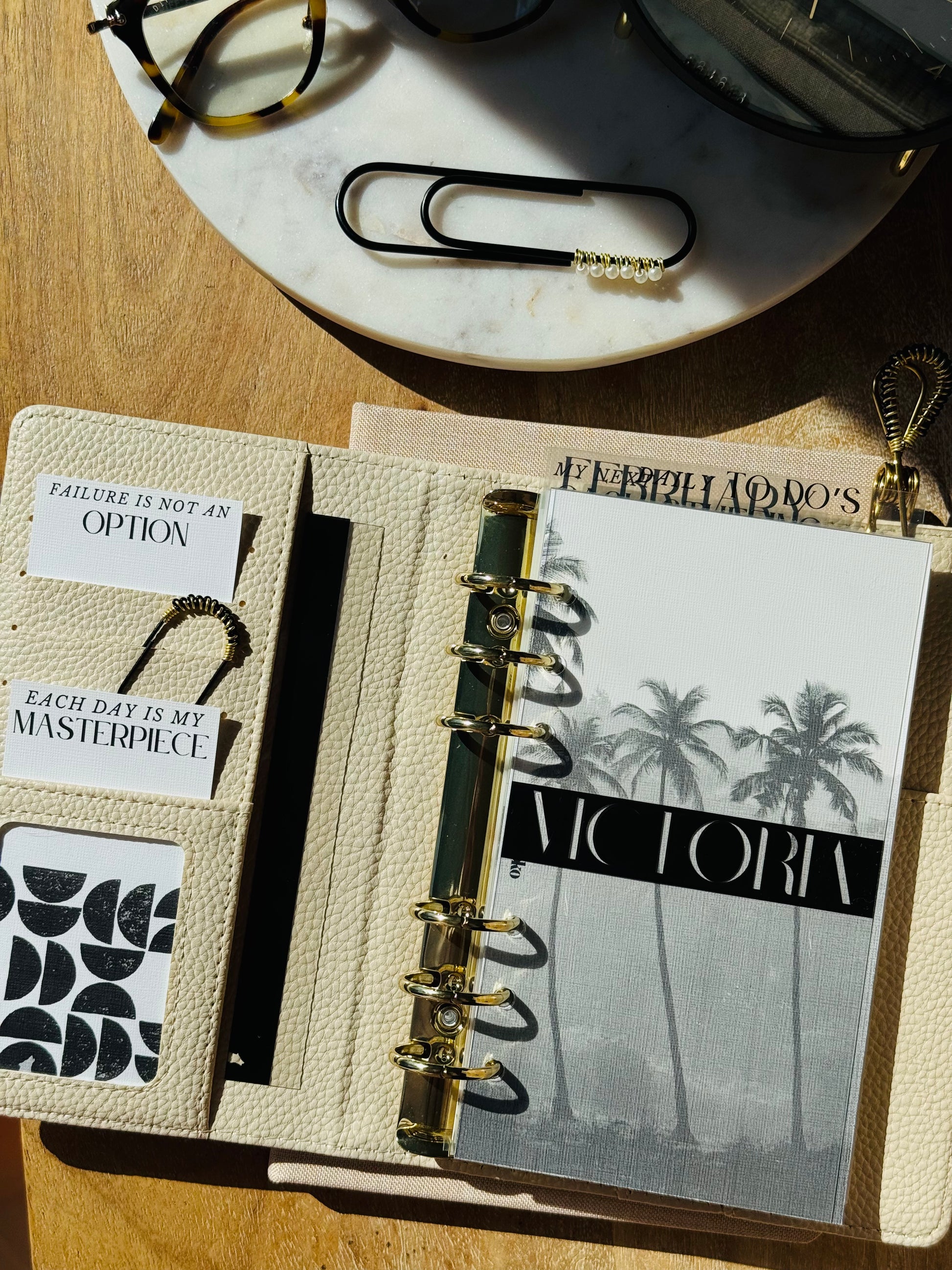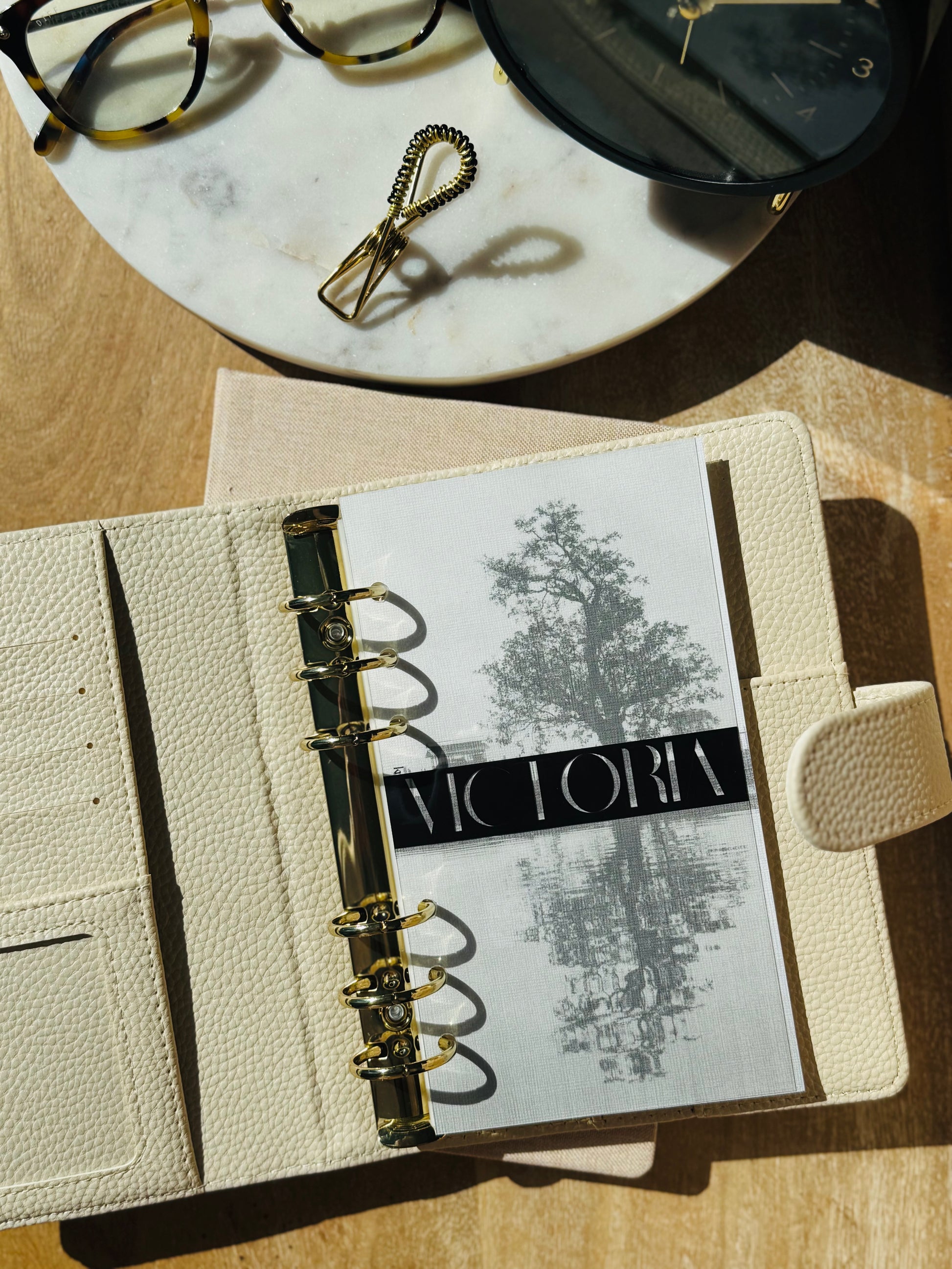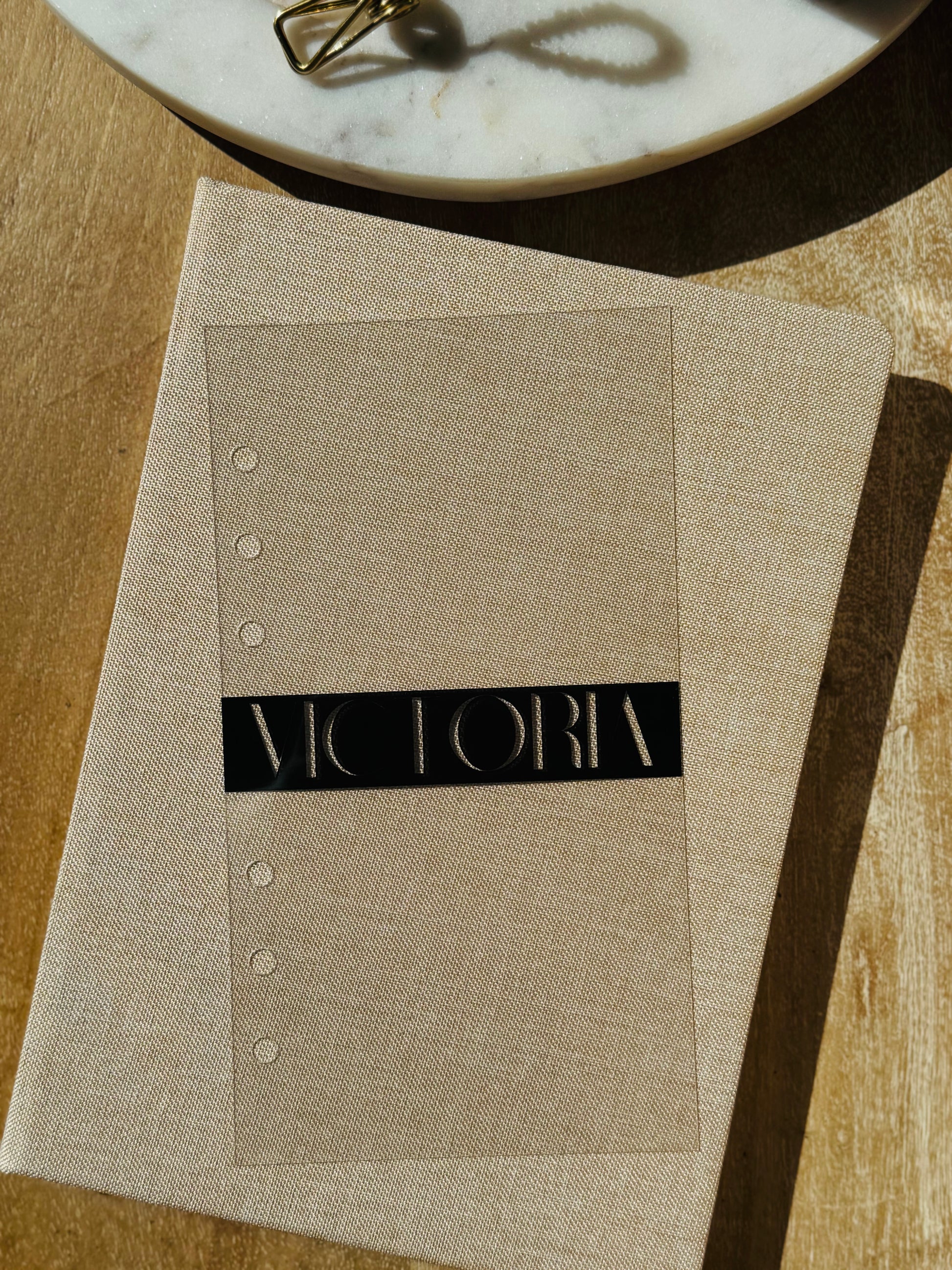 Elevate your dashboard game with the bold and daring design of Nova Bella. Featuring a sleek black stripe and customizable white text, it's perfect for layering with other dashboards from your collection. Personalize it further by adding your name in the designated customization area, just remember that more letters mean a smaller font size. Available in A7, A6, and A5 sizes.