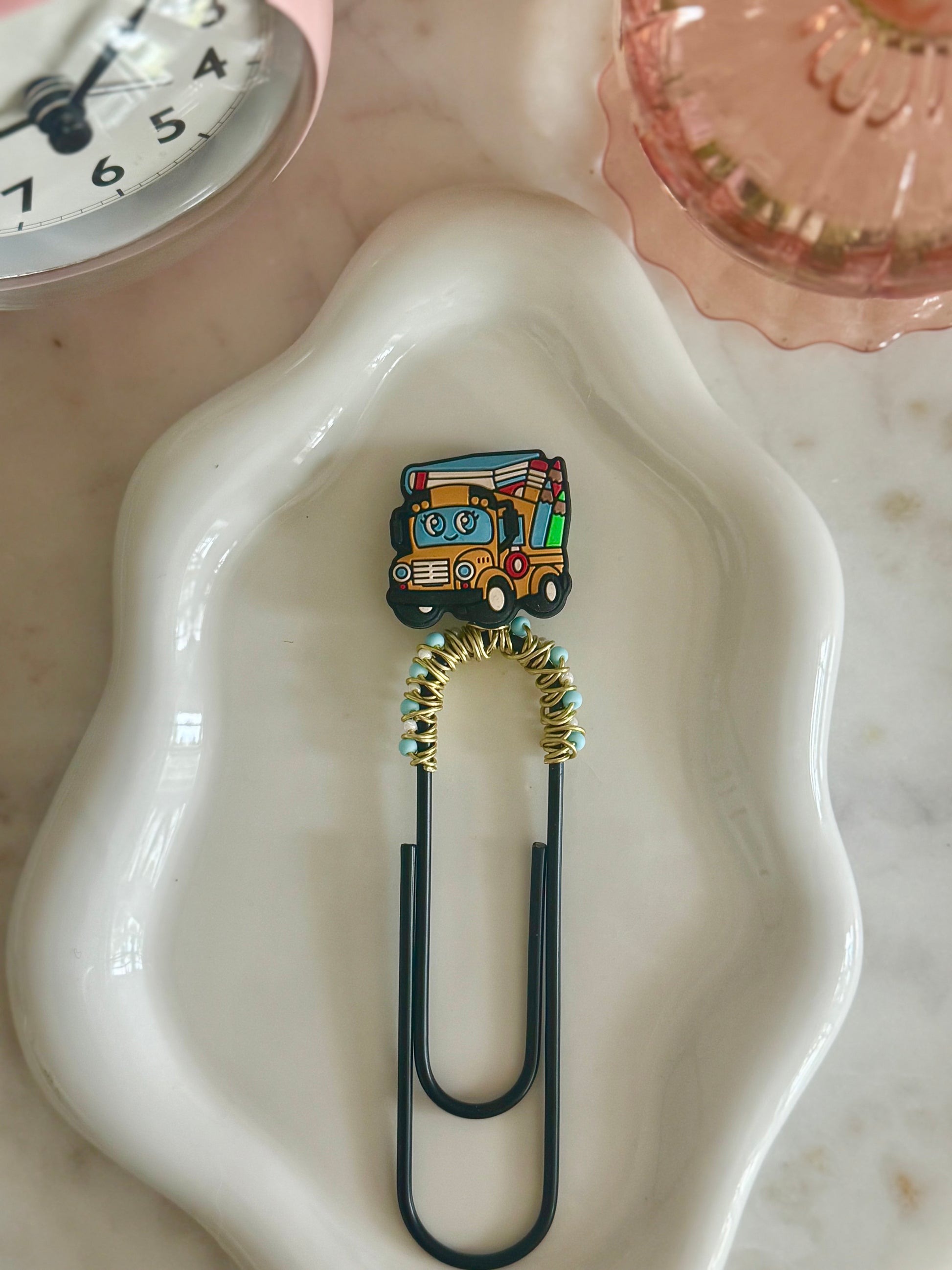 Climb aboard with Buddy the Busβyour bright and bubbly ride to school-day fun! This adorable paperklip features a sunny yellow bus with big friendly eyes, holding onto pencils and books, and accented with pops of blue and coordinating beads.