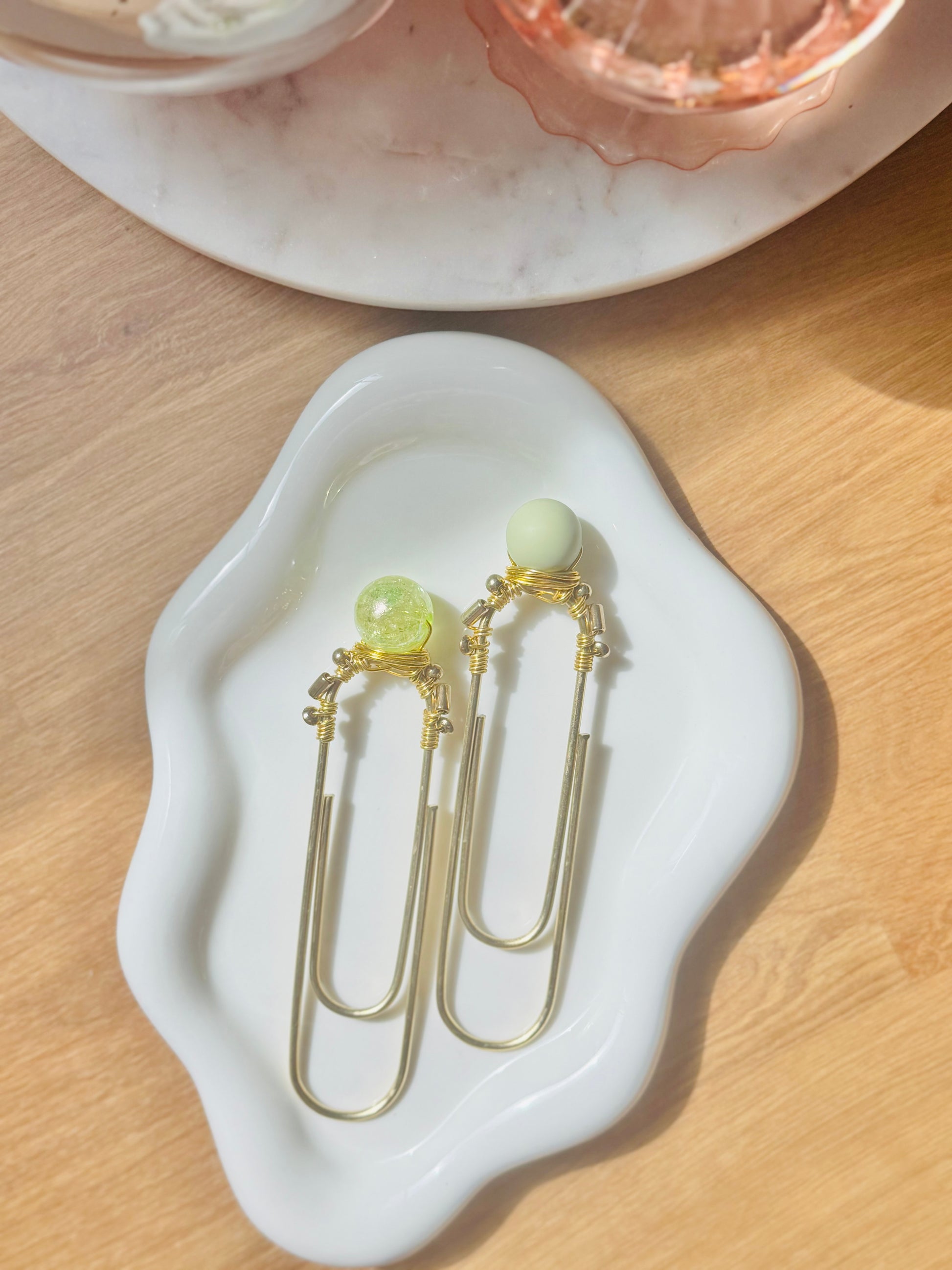 Refresh your organization with the Iced Matcha duo — two chic paperclips adorned with soothing green beads and wrapped in gleaming gold wire accents. Inspired by the calm, vibrant tones of a perfect matcha latte, these clips add a touch of serene elegance to your planner, journals, or wallet. Stylish, functional, and oh-so-refreshing!