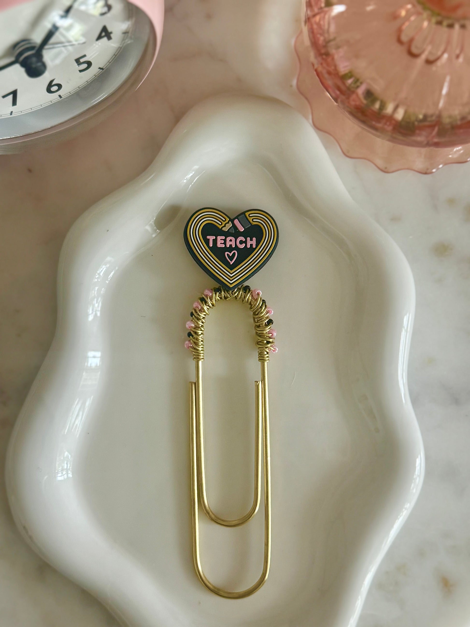 Celebrate the heart of teaching with Shaping Hearts! This inspiring paperklip features a bold black heart outlined by a bright yellow-and-white pencil with a pink eraser. In the center, the word Reach is written in soft pink, paired with a tiny pink heart. Finished with black and pink accent beads, it’s a beautiful reminder of the love and guidance teachers bring into every classroom.