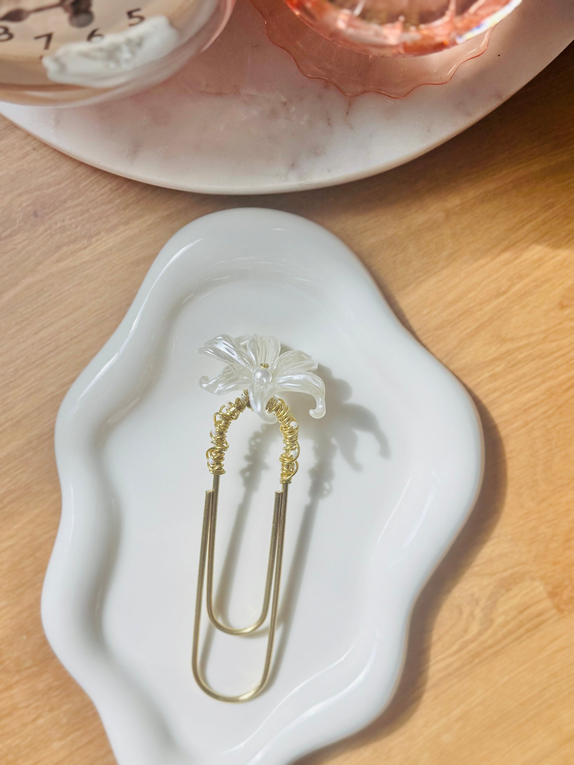 Elevate your organization with the timeless beauty of the Silken Petal jumbo paperclip. Featuring a graceful white petaled flower crowned with a lustrous pearl, set on your choice of gleaming gold or silver, this paperclip adds a touch of refined elegance to your planner, documents, or wallet. Perfect for those who appreciate delicate details and sophisticated style in their everyday essentials.