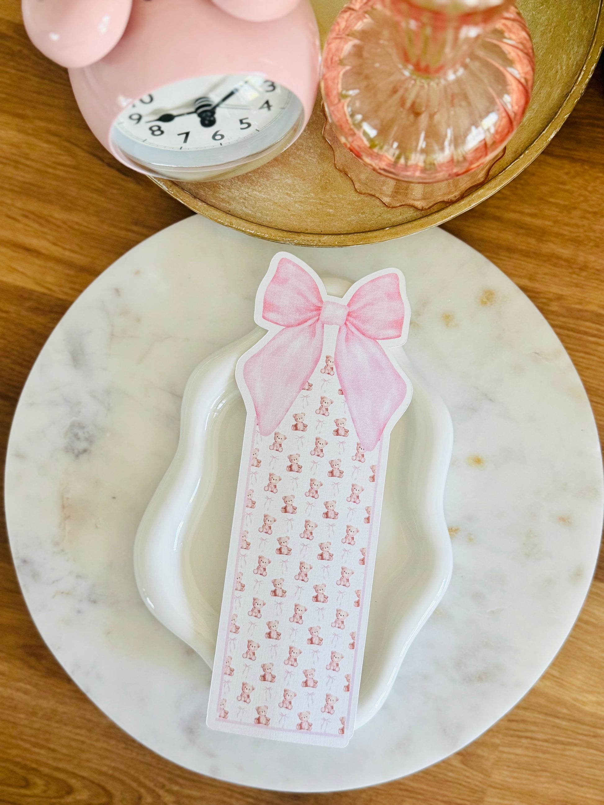 Your pages just found their cuddle buddy. Meet SnuggleMark—a charming teddy bear bookmark designed to bring a soft, coquette touch to your reads. Made from textured linen paper and dressed to impress with a big pink bow perched sweetly on top, this little bear adds a gentle pop of personality to your books, planners, or journals.