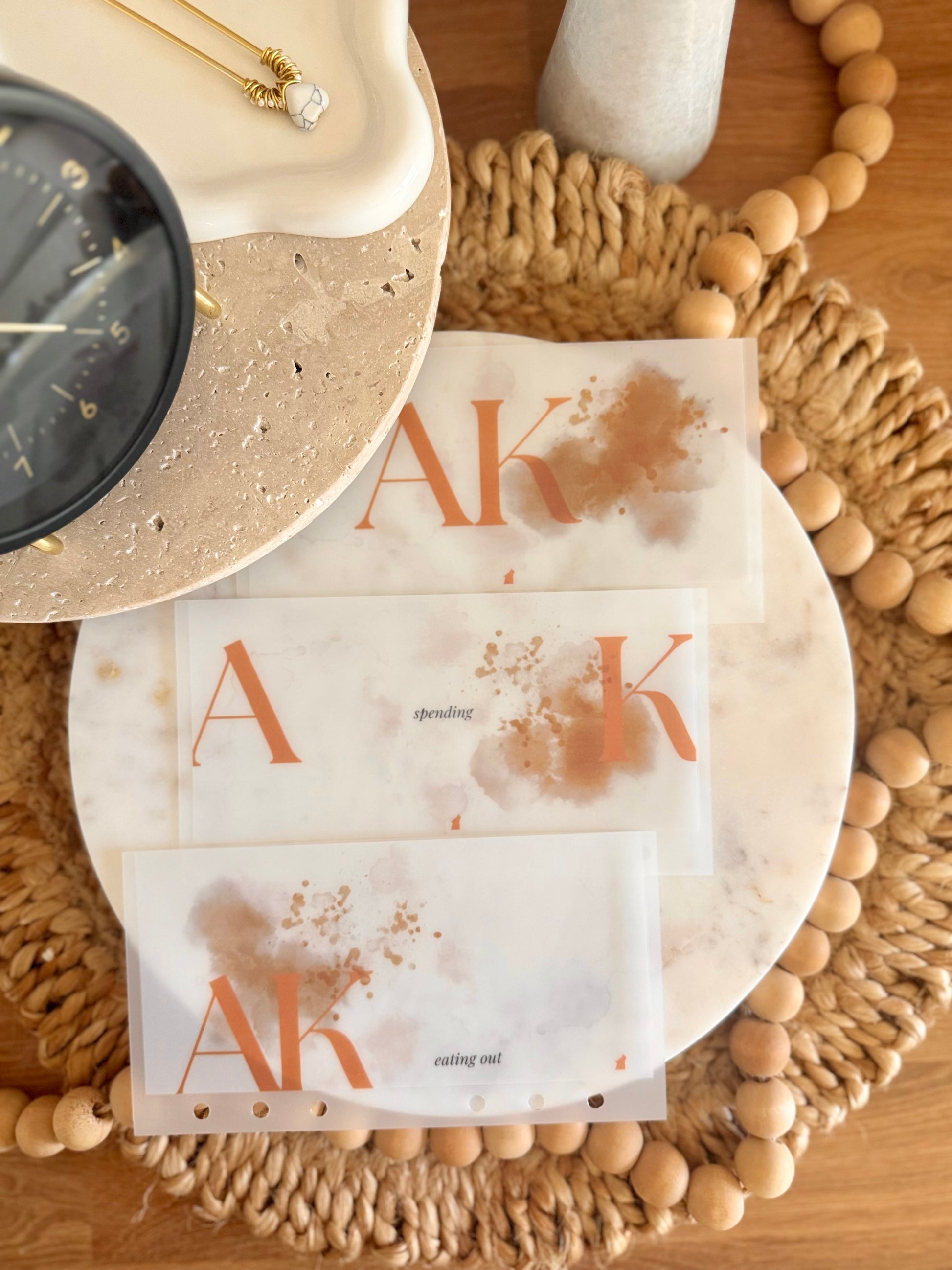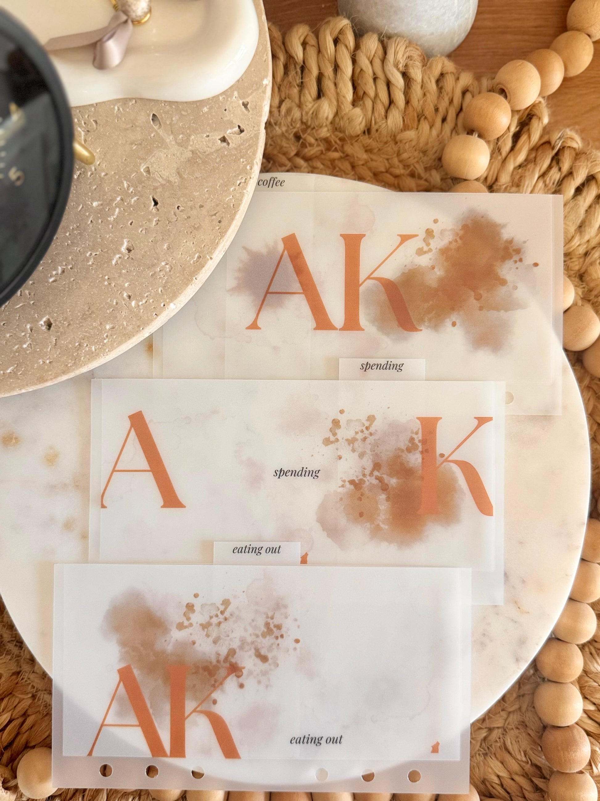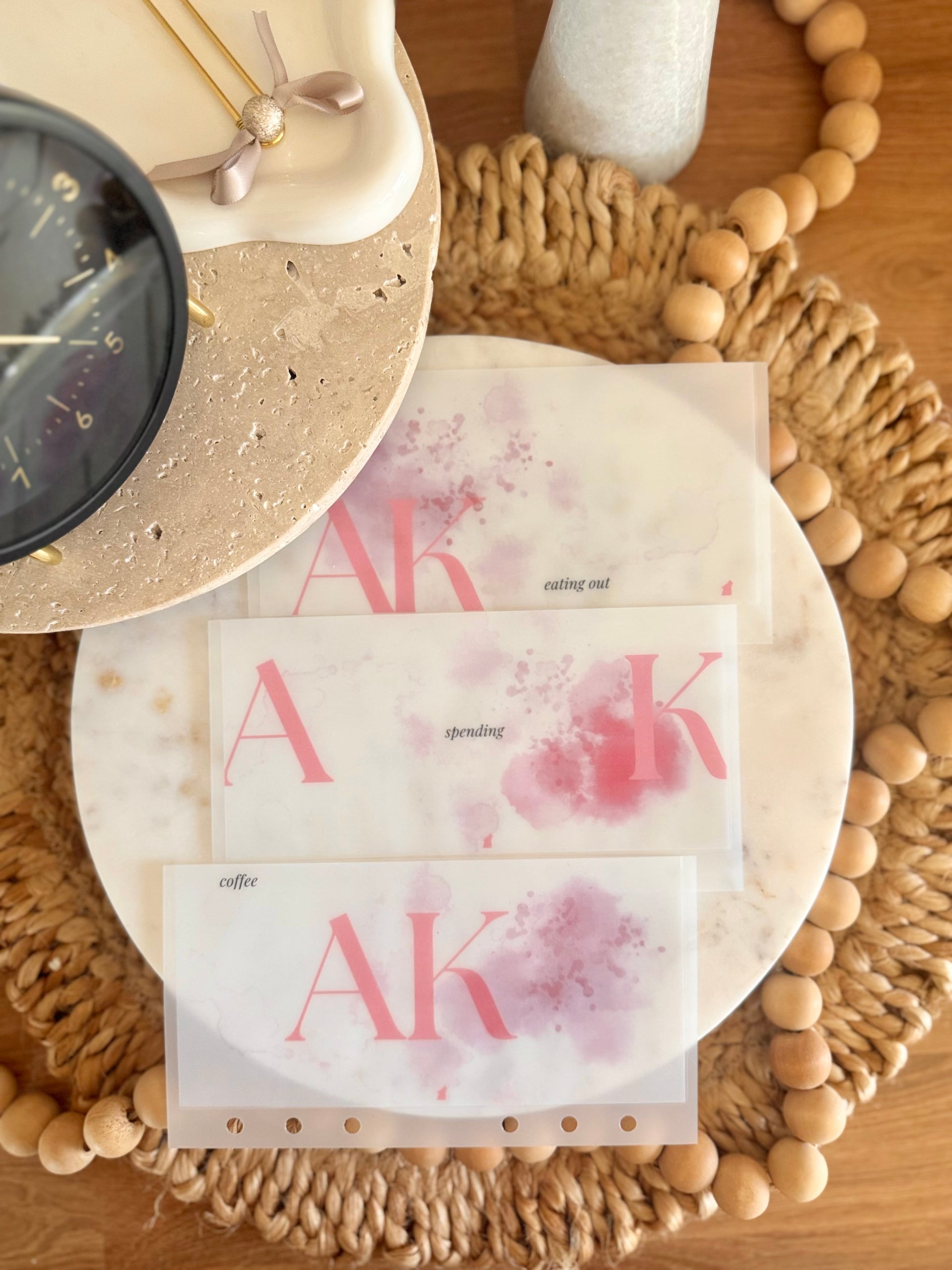 A blend of calm artistry and purpose. The Stone & Script Cash Envelopes bring a refined touch to your budgeting routine, featuring your custom initials in a bold font layered over a soft ink splotch and smoky watercolor design. Each envelope is finished with your custom category name in elegant text, creating a personalized balance between structure and serenity.
