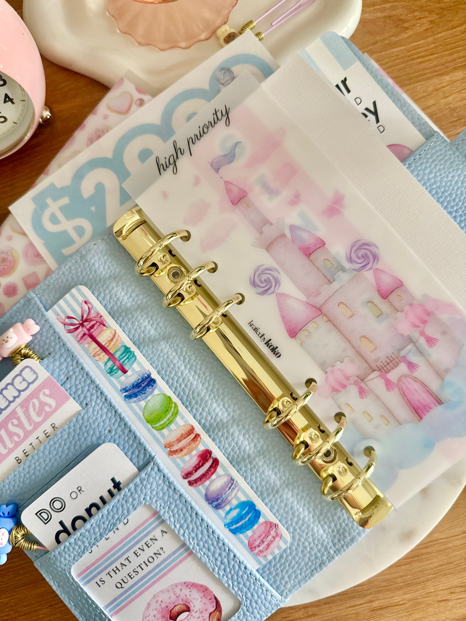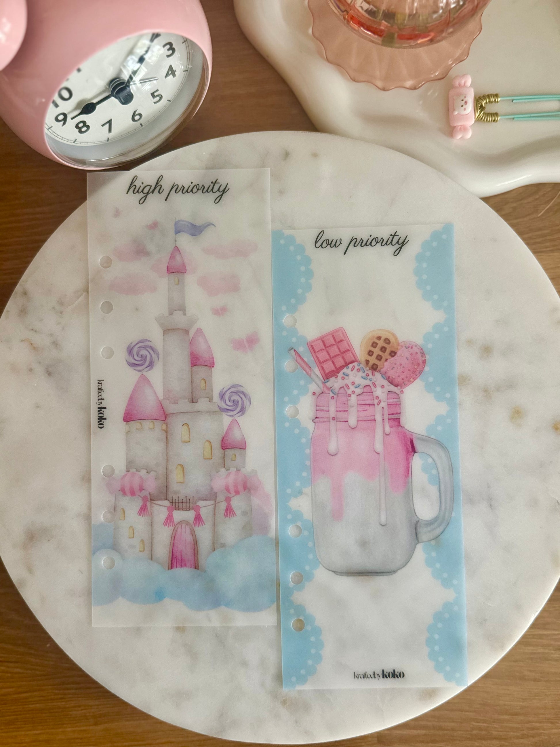 Organize your binder with a swirl of sweetness! Our Sugar & Scoop dividers are crafted on soft matte vellum and feature pastel-perfect designs—choose from a whimsical candy castle or a mason jar overflowing with treats, all perched on scoops of dreamy ice cream.