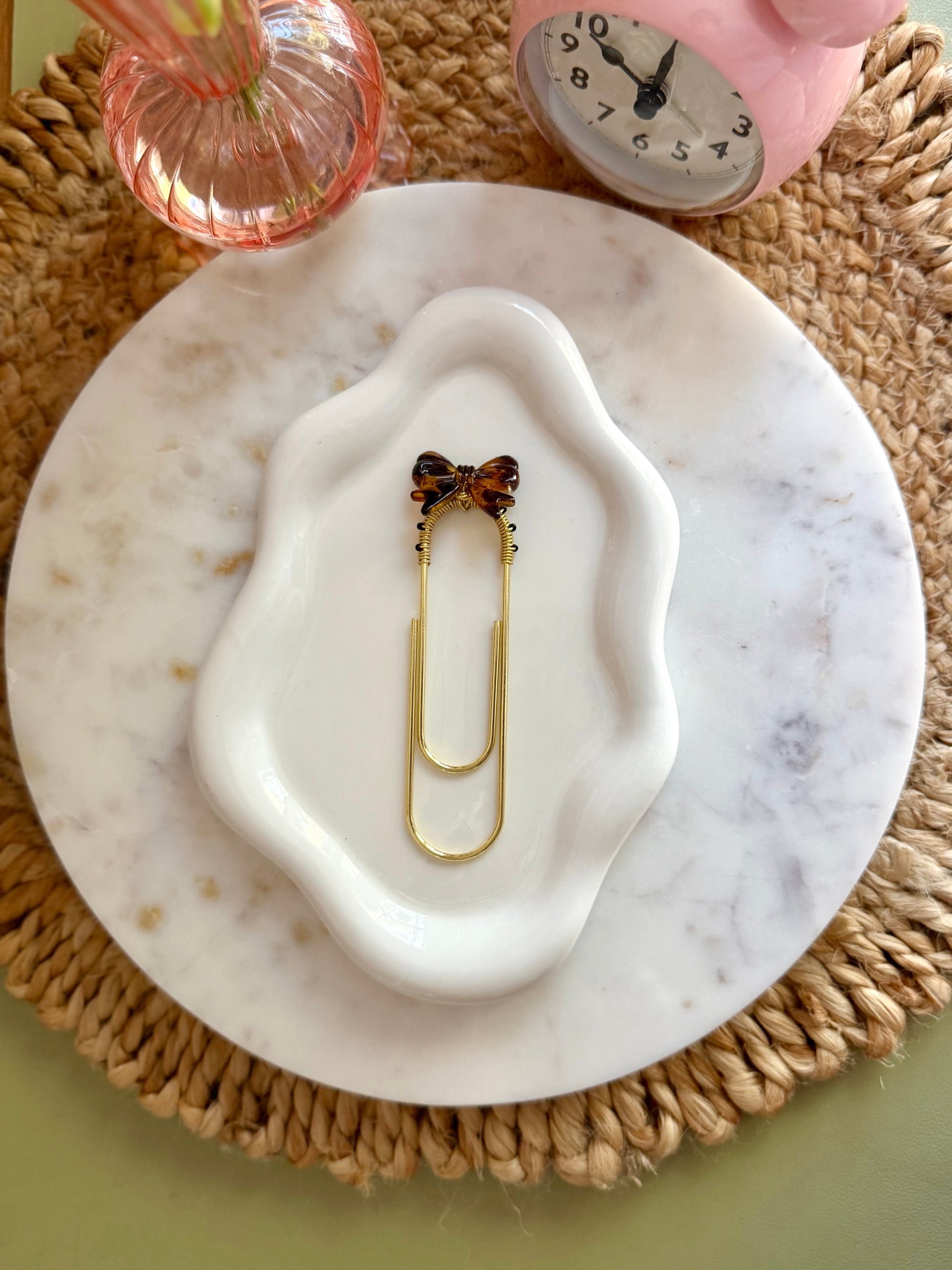 Featuring a beautifully patterned tortoiseshell bow atop a gold jumbo paperclip, this design is accented with subtle black beads that add depth and structure without overpowering its natural warmth. The rich amber tones paired with sleek black detailing create a look that feels both refined and enduring.