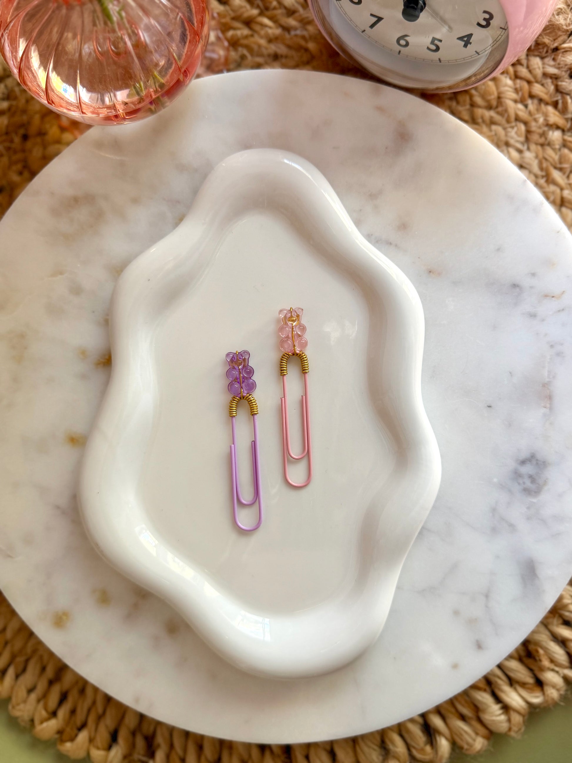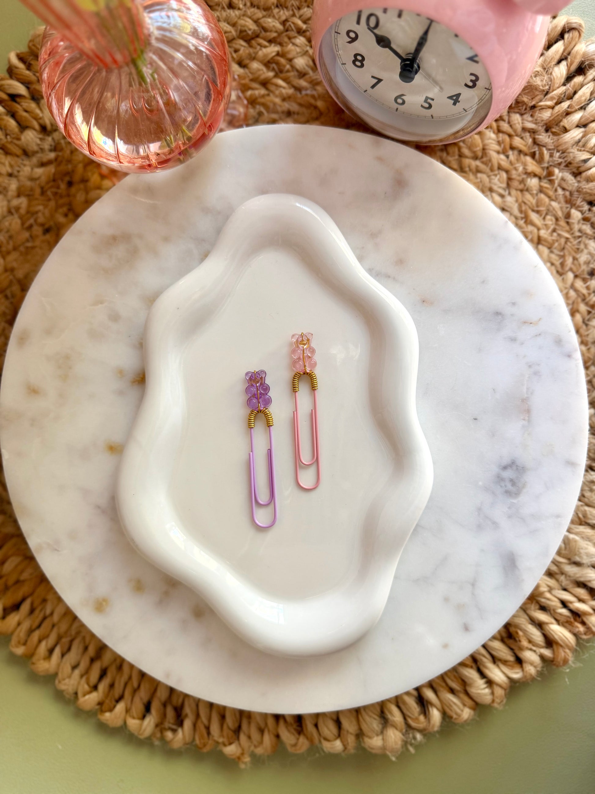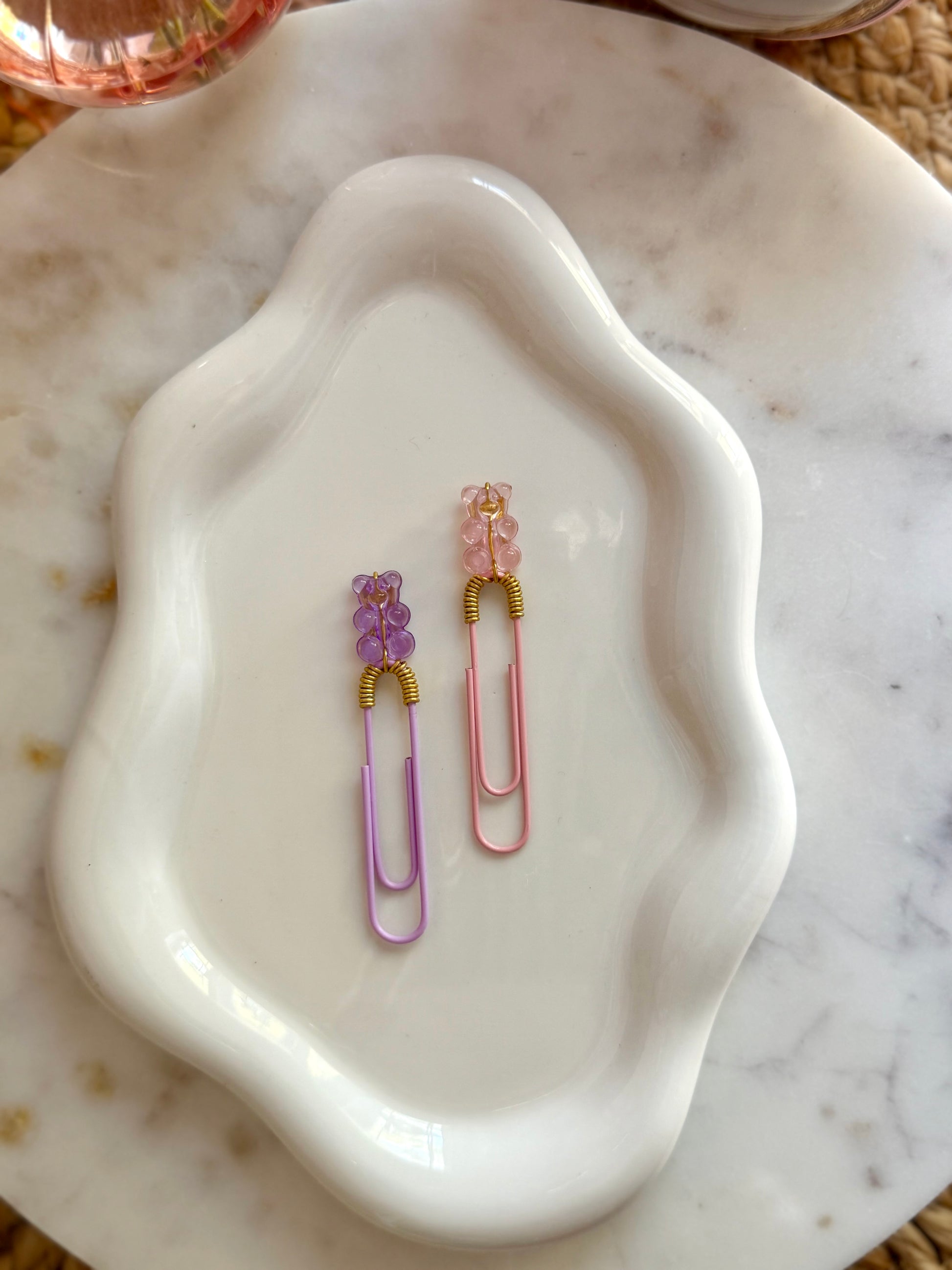 This set features one purple gummy bear on a coordinating purple clip and one pink gummy bear on a matching pink clip.