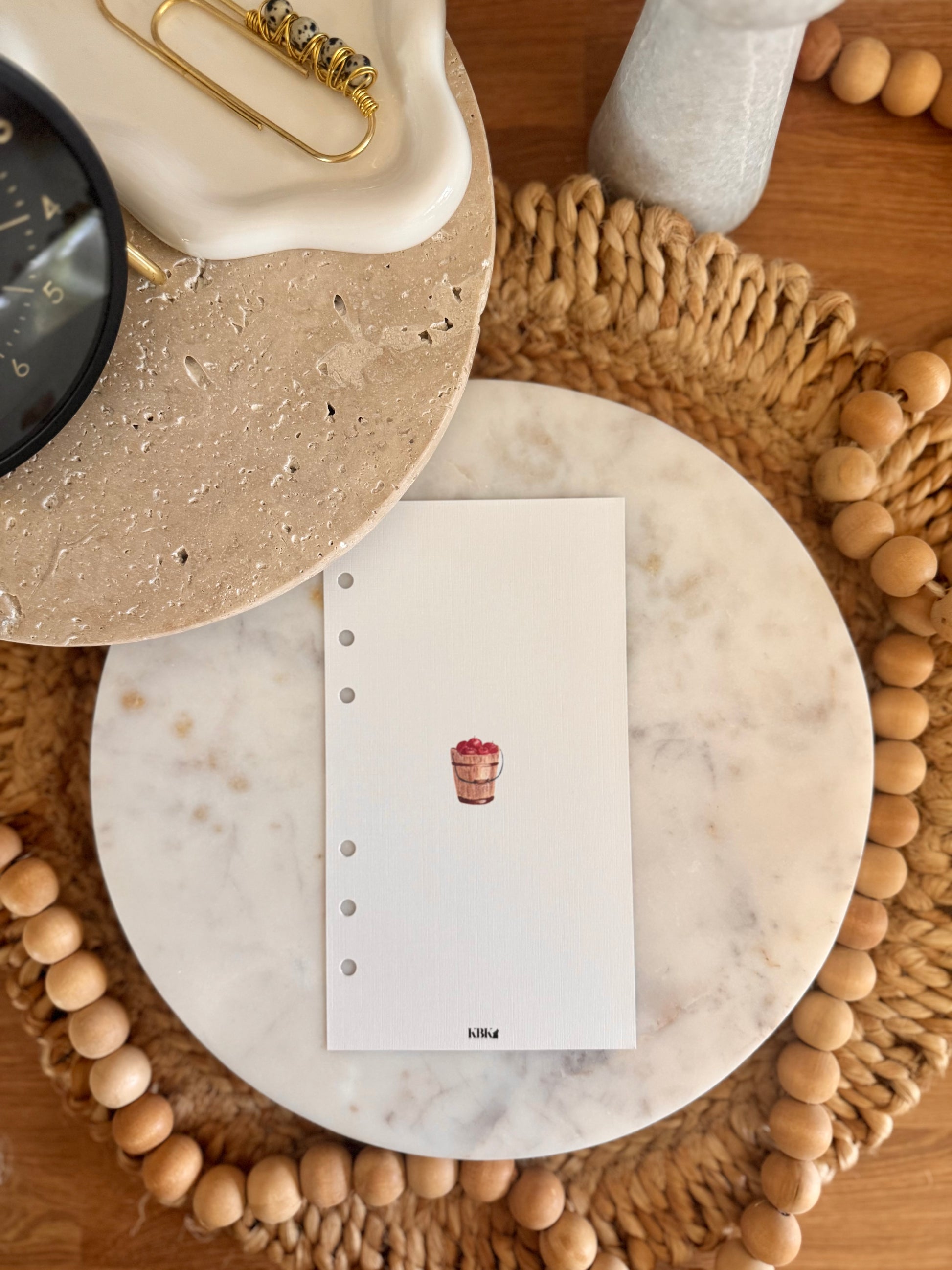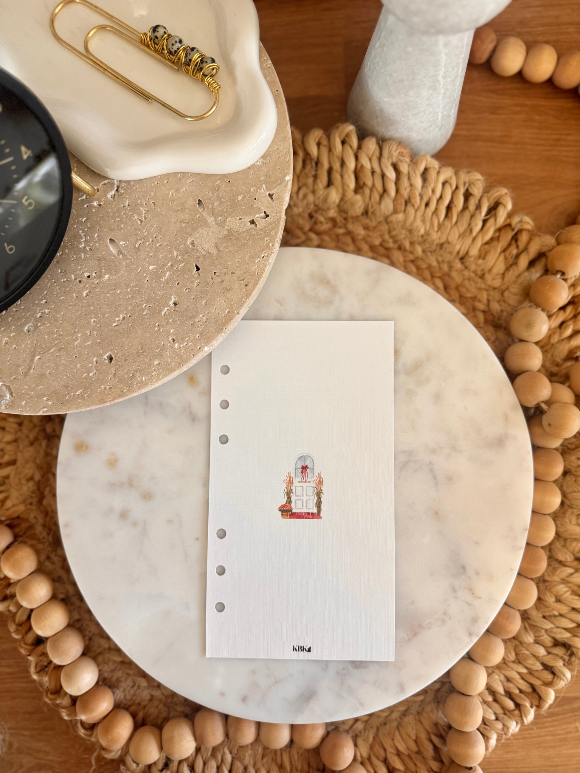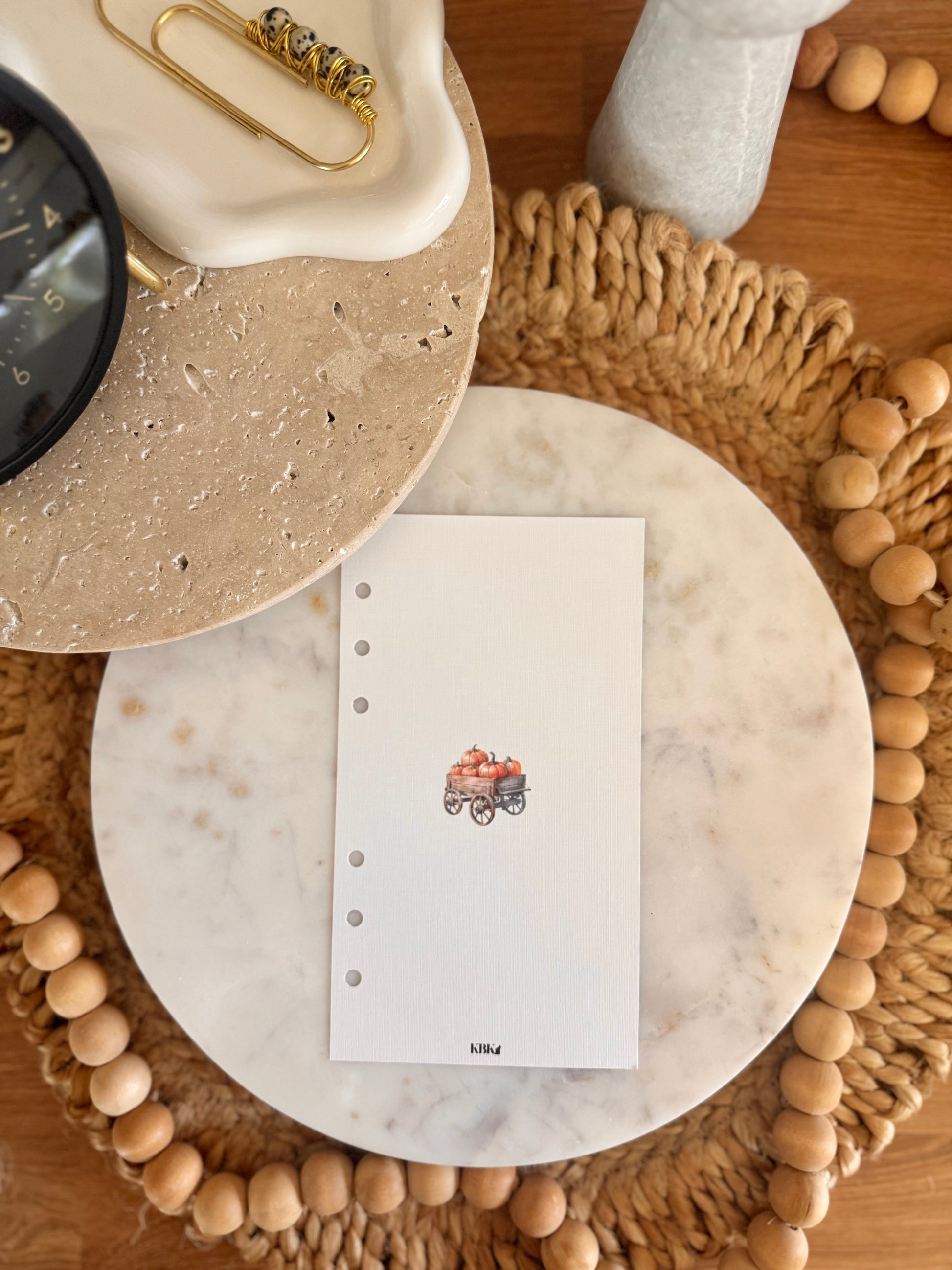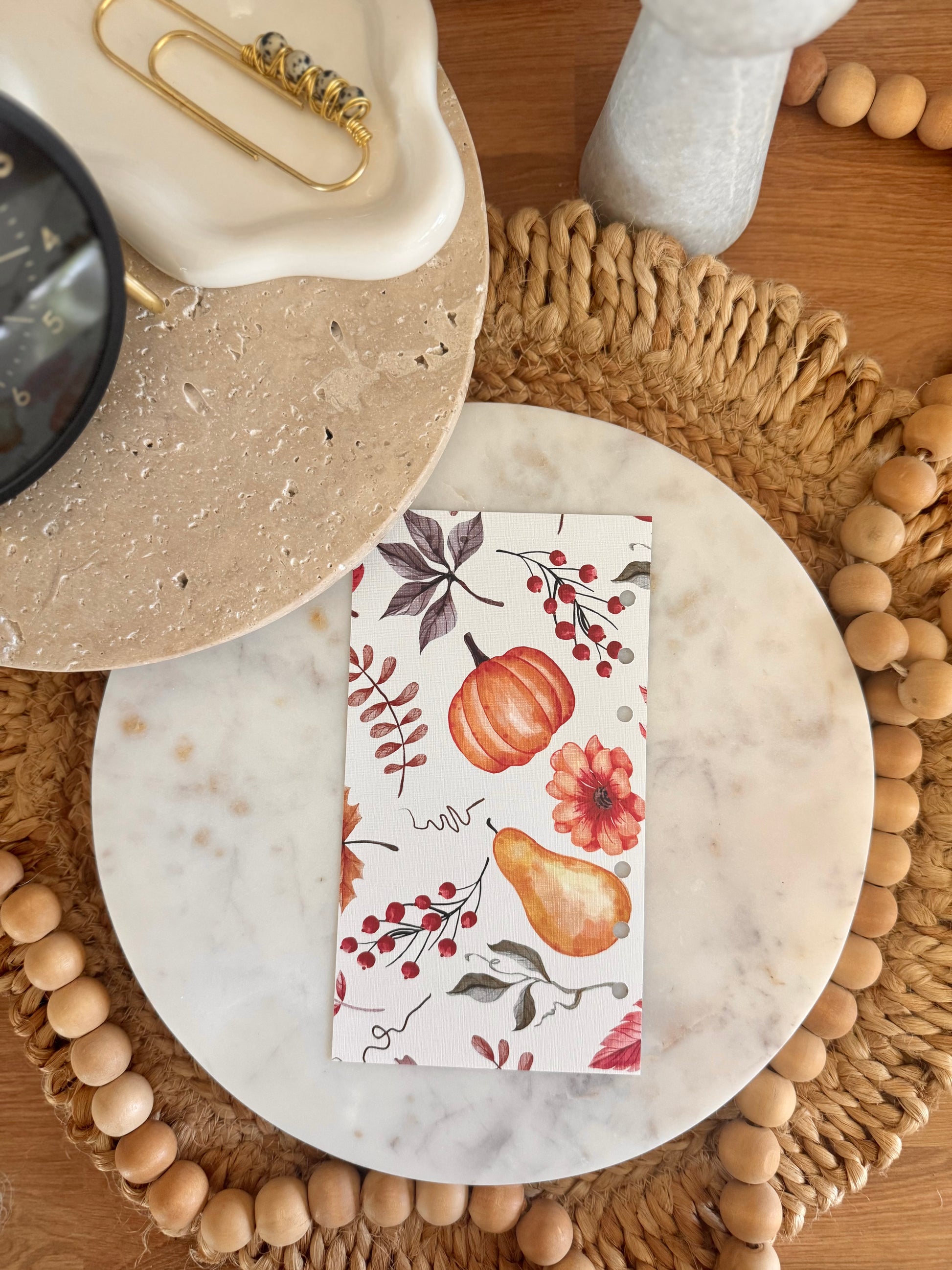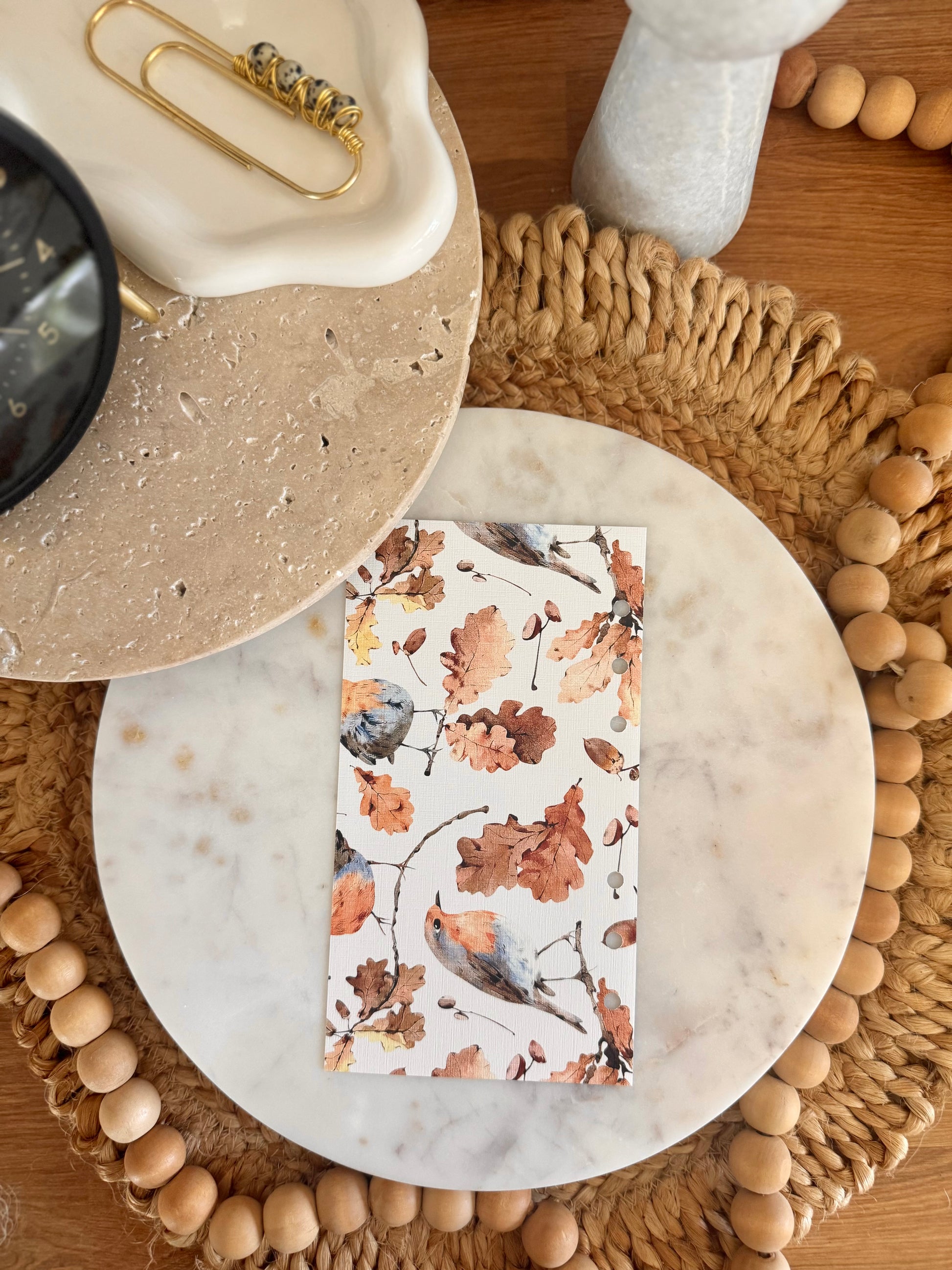 On one side, you’ll find a minimal fall illustration that captures the quiet beauty of the season. Flip it over to reveal a cozy coordinating pattern, perfect for layering in your binder, wallet, or planner.