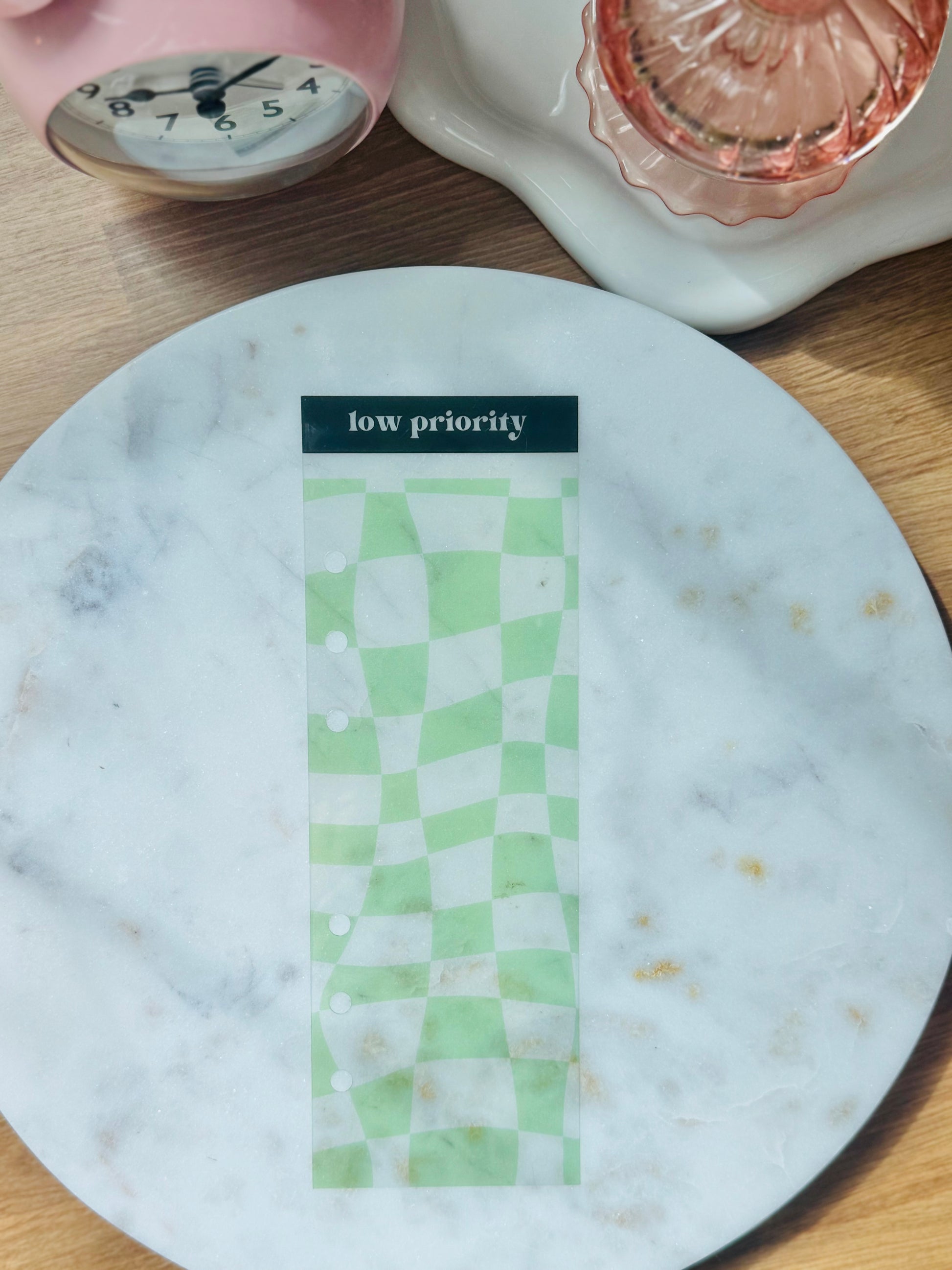 Sizing: 7.5 inches by 2.5 inches. Fits in A6/Personal wallet binder.