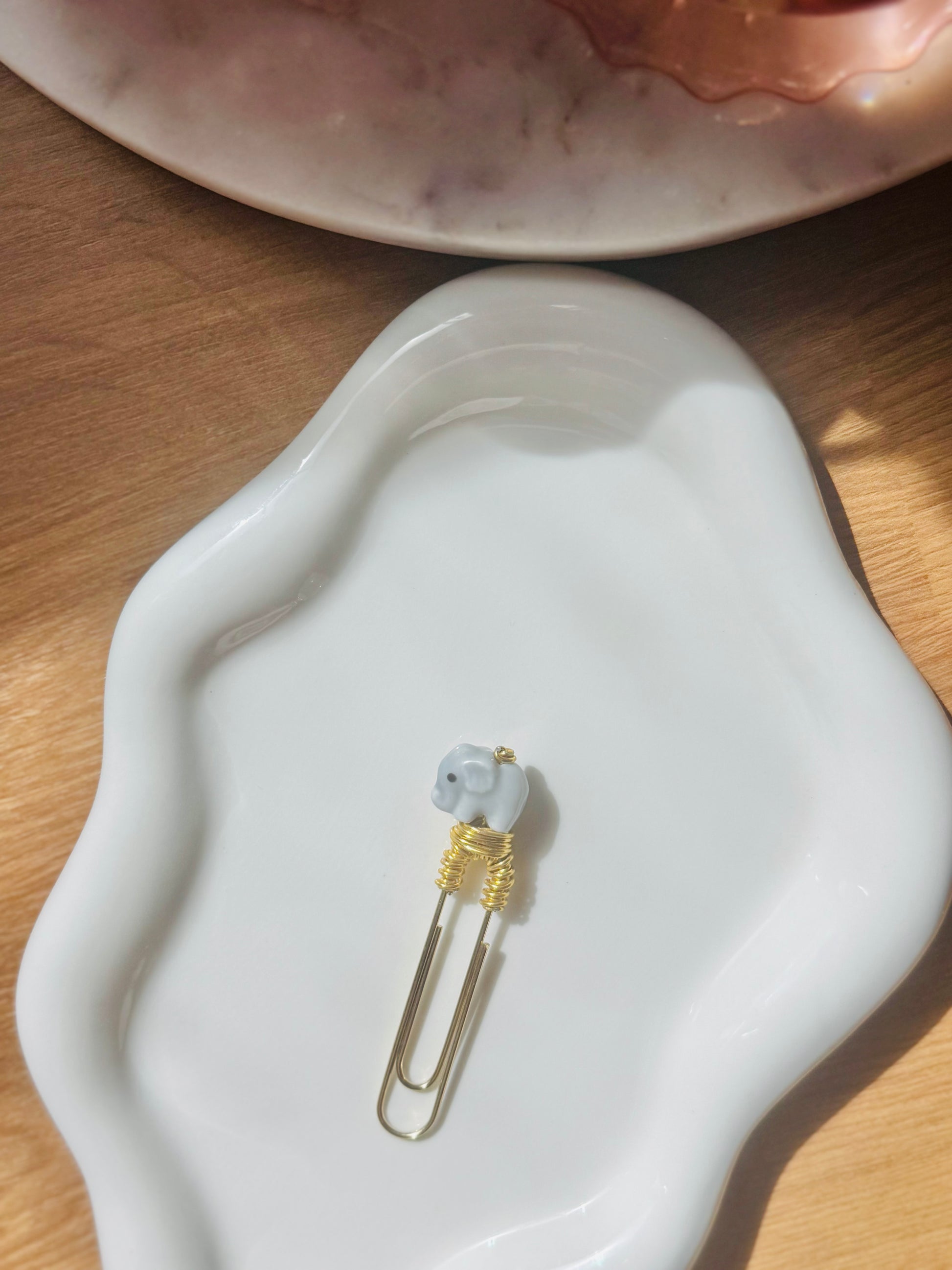 Inspired by the gentle courage and whimsical spirit of a little elephant who dared to fly, the Trunk & Tumble paperclip features a glass grey elephant perched delicately atop a sleek clip. Each piece captures the soft shimmer and graceful charm of timeless stories, adding a touch of magic and strength to your planner, journals, or wallet. Carry a reminder of gentle bravery and limitless possibilities wherever you go.