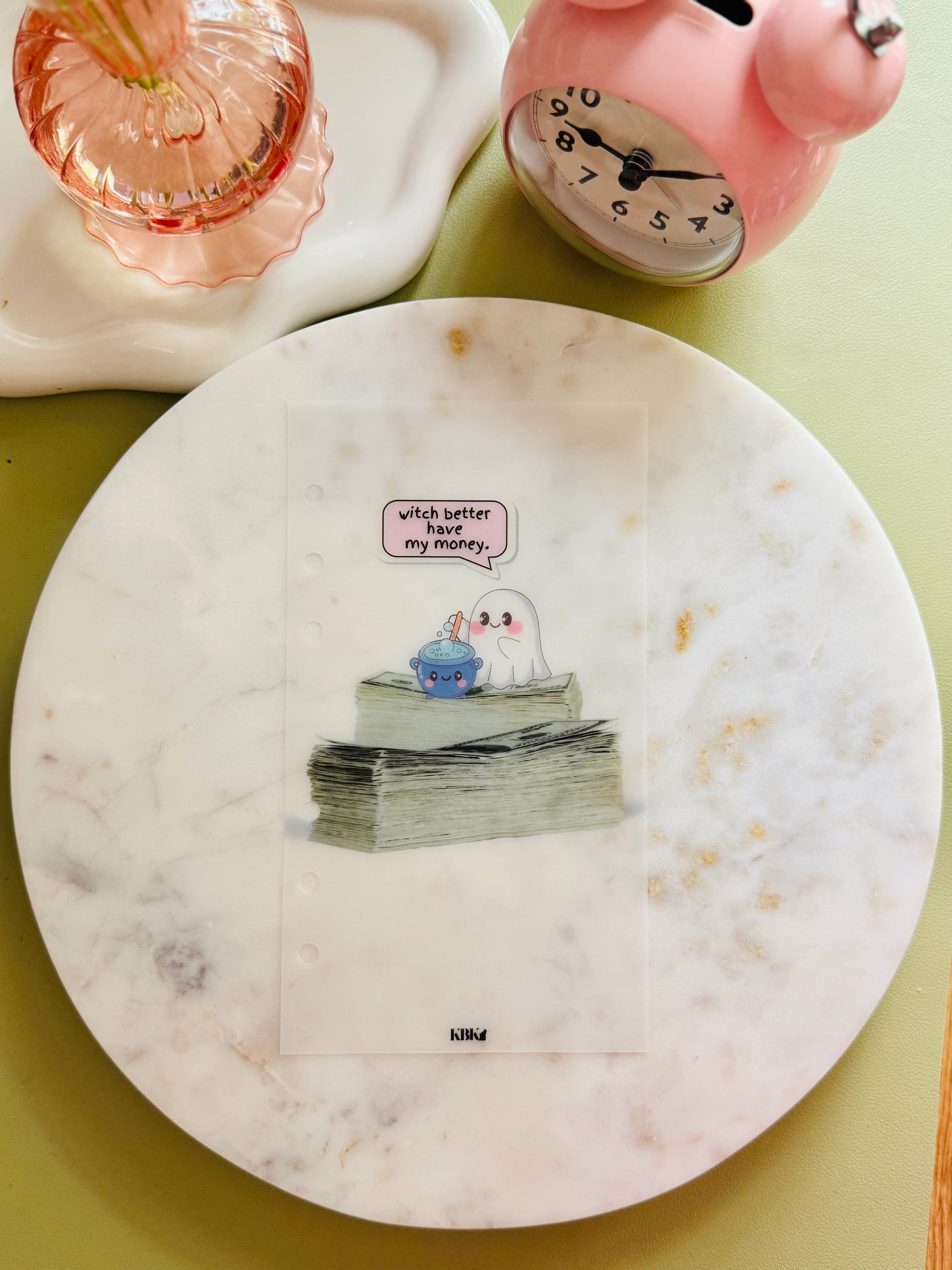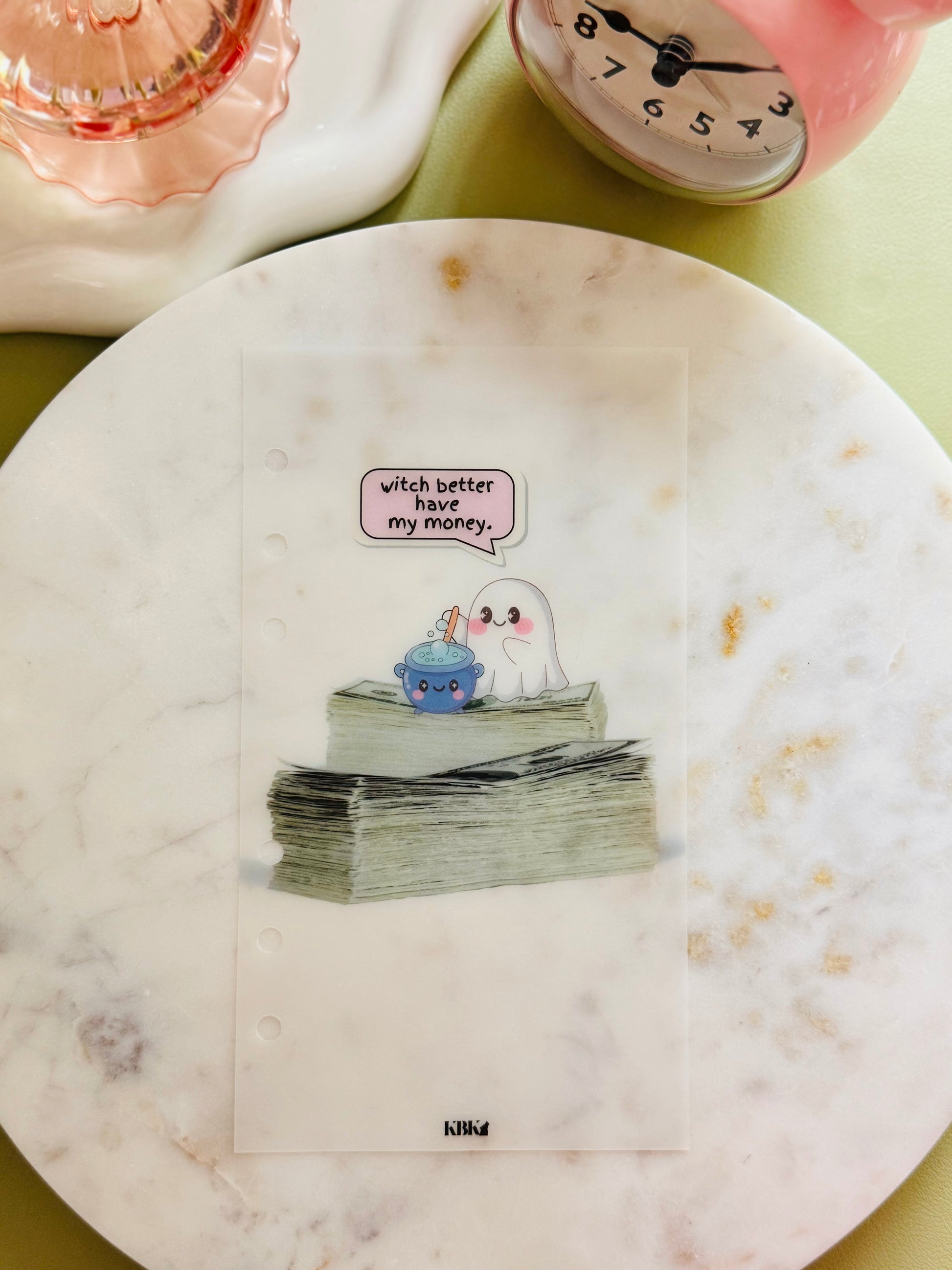 Not your average ghost—this one’s got bills to stack and spells to cast. Sitting on a mountain of cash with a cauldron bubbling over, they’re serving spooky and savage with the line: “Witch better have my money!” 💸👻